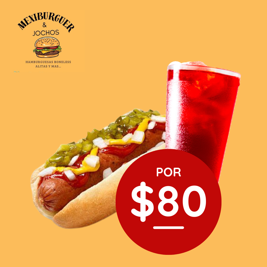 Pan Jumbo, salchicha jumbo, boneless aderezo a elegir, jitomate, cebolla y aderezos.