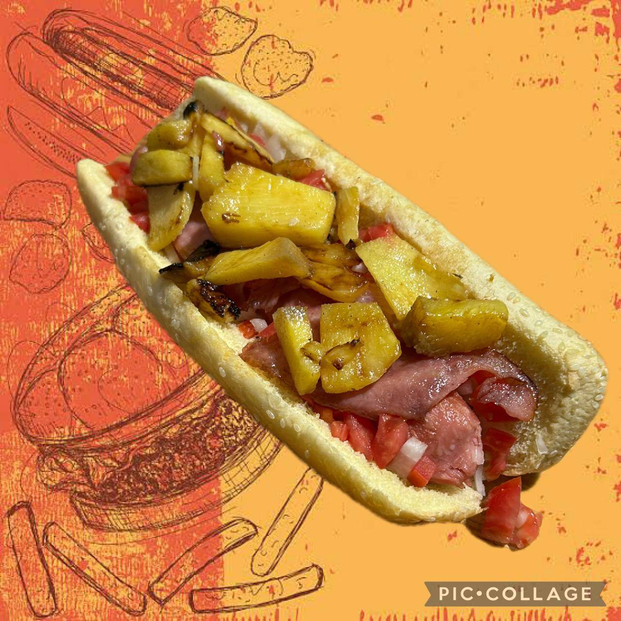Pan Jumbo, Salchicha Jumbo, tocino, piña, jitomate, cebolla y aderezos.