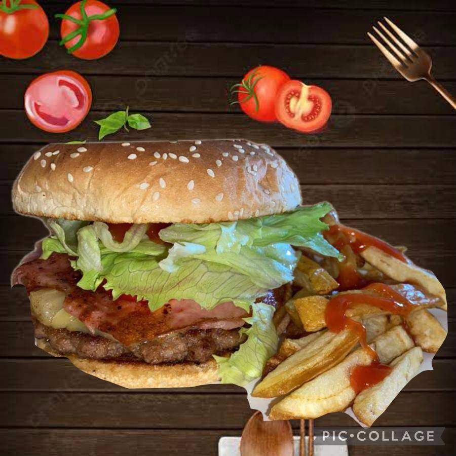 1 hamburguesa especial (pan grande bimbollo, carne 120 gramos, queso amarillo,jamon, tocino, jitomate, cebolla, pepinillos, aderezos) con papas 100 gramos.