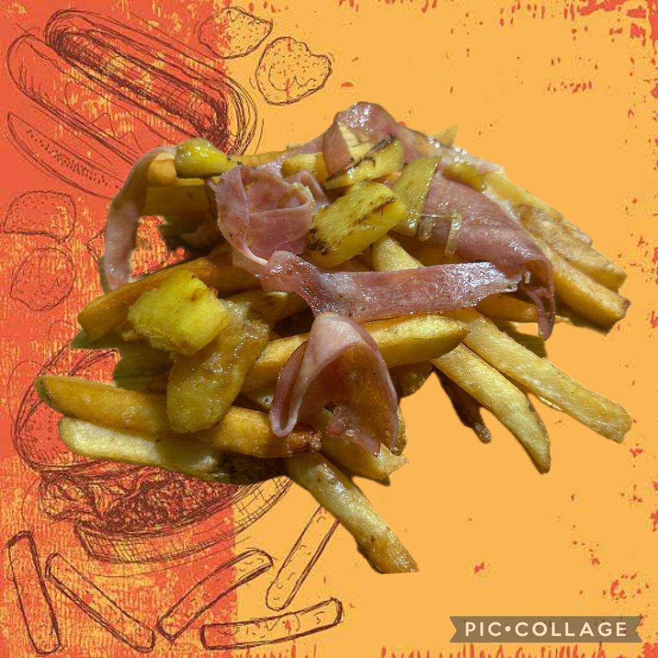 200 grs de papas, topping de piña y tocino.