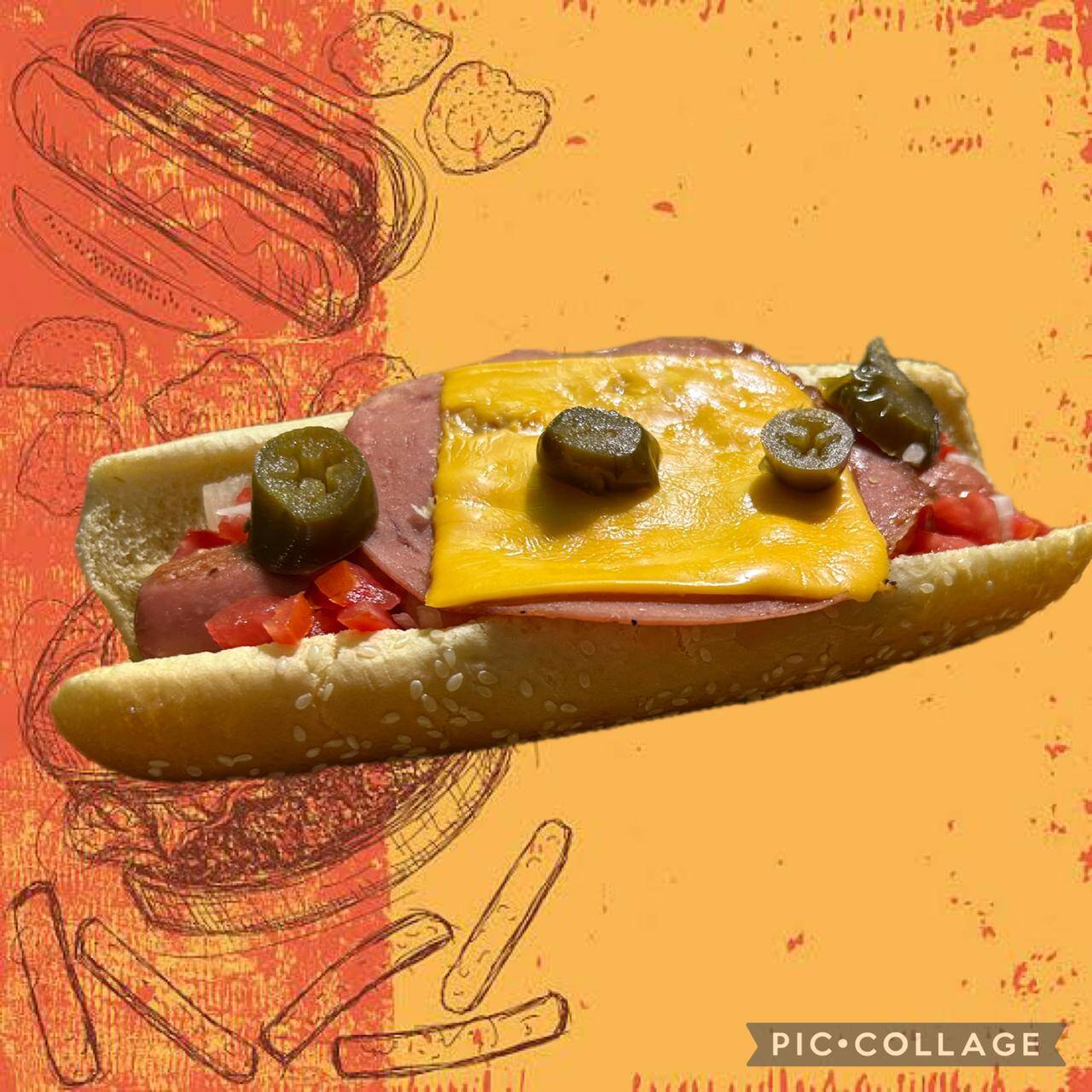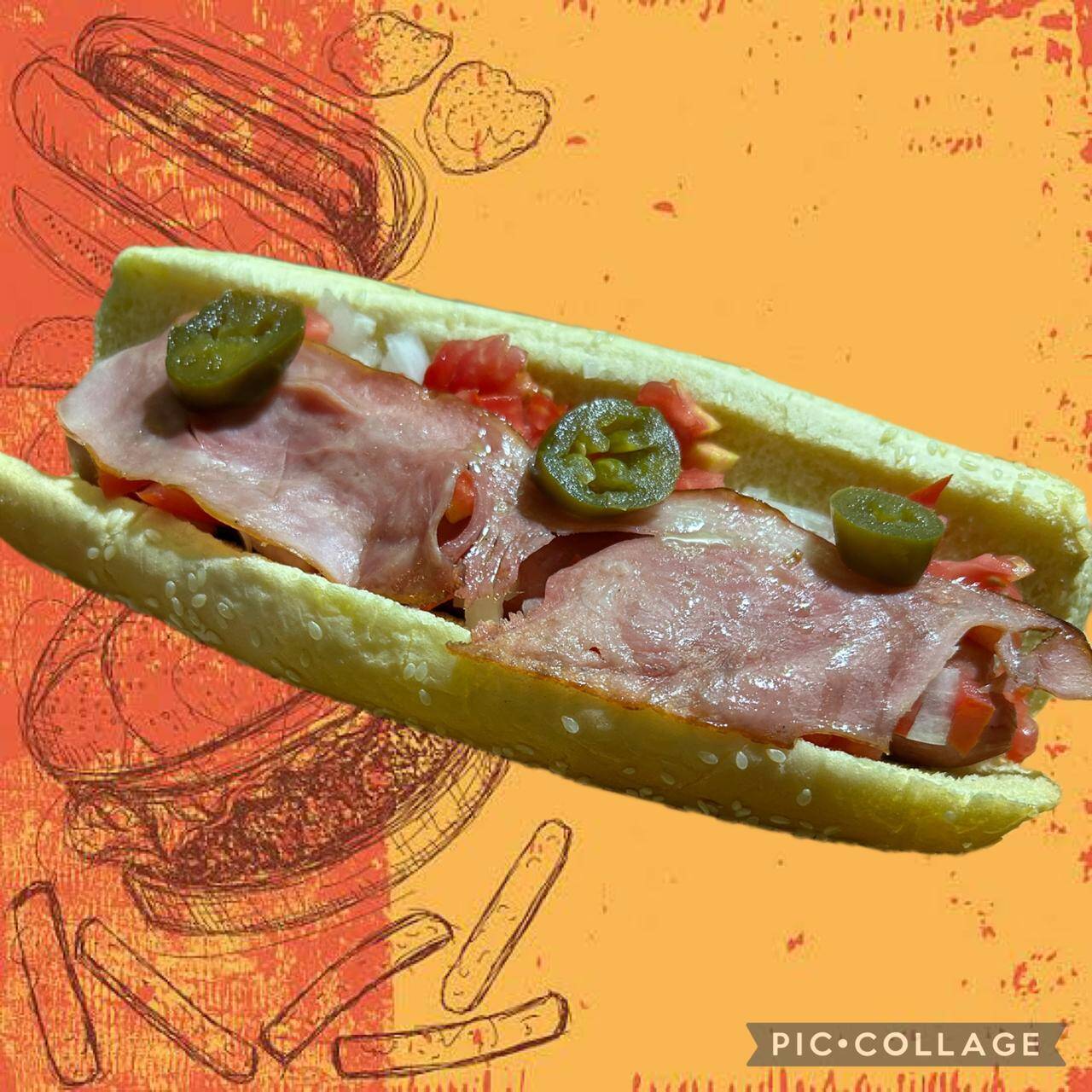 Pan Jumbo, sachicha jumbo, jamon, queso amarillo, jitomate, cebolla y aderezos.