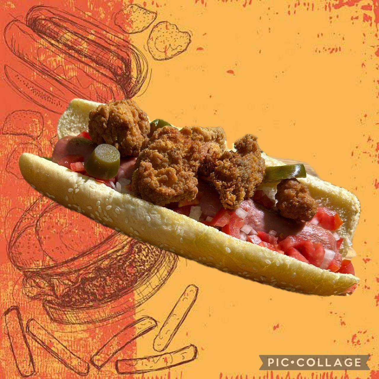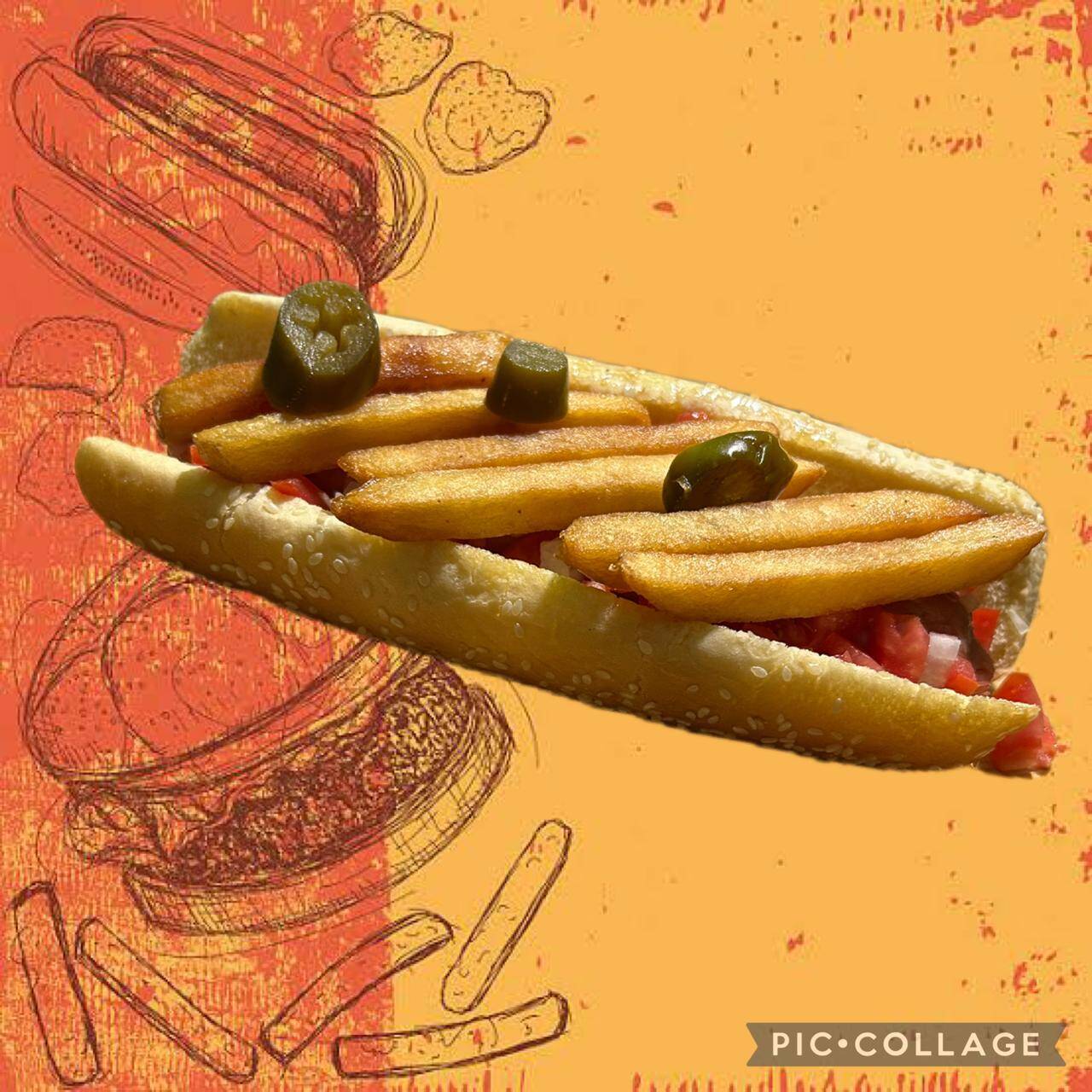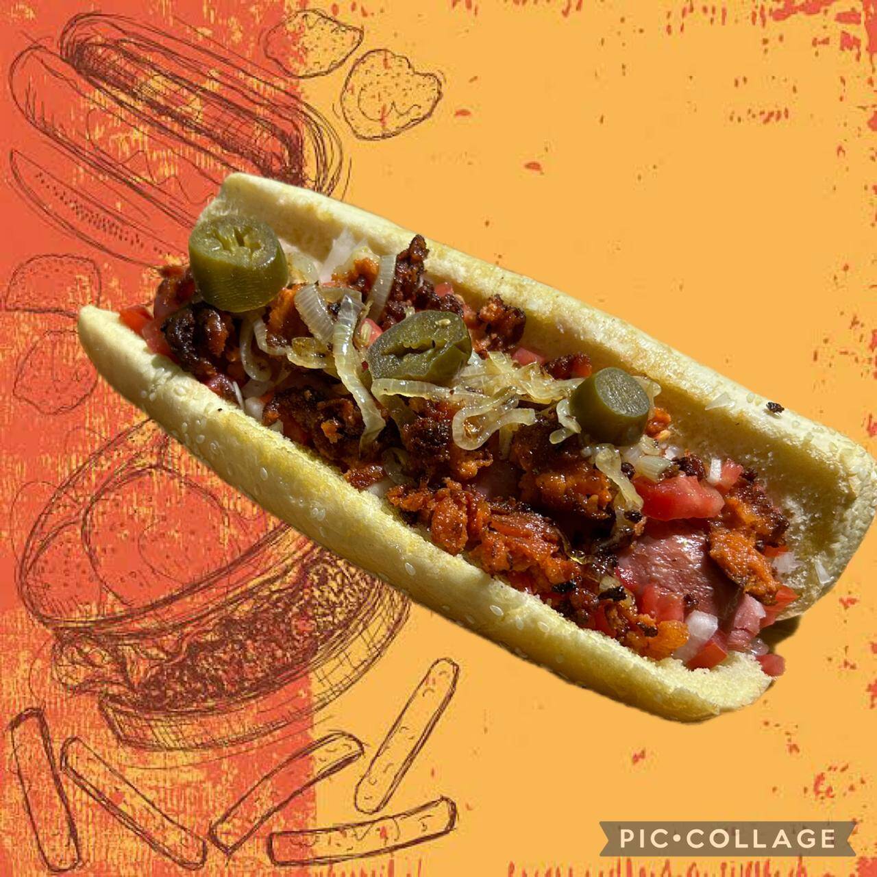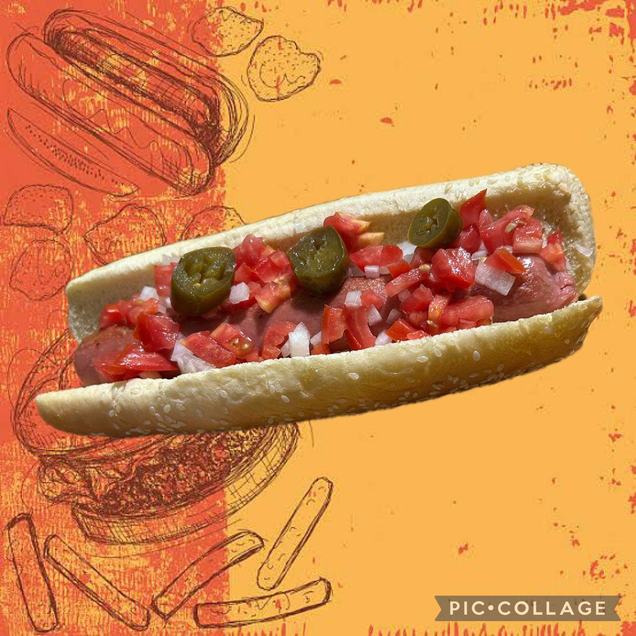 Pan Jumbo, salchicha jumbo, topping de doritos, jalapeños, jitomate, cebolla y aderezos.