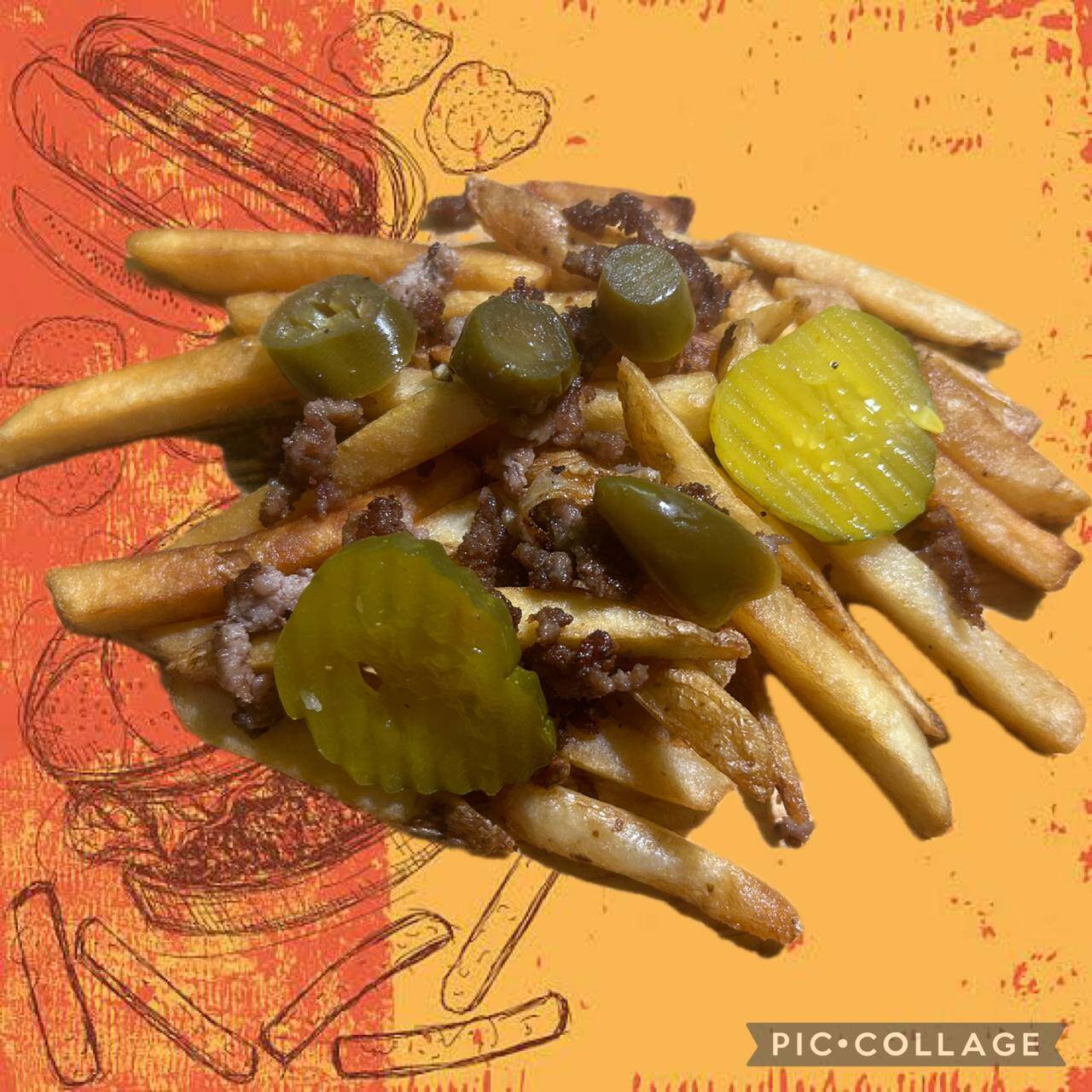 200 grs de papas, topping de carne y pepinillos.