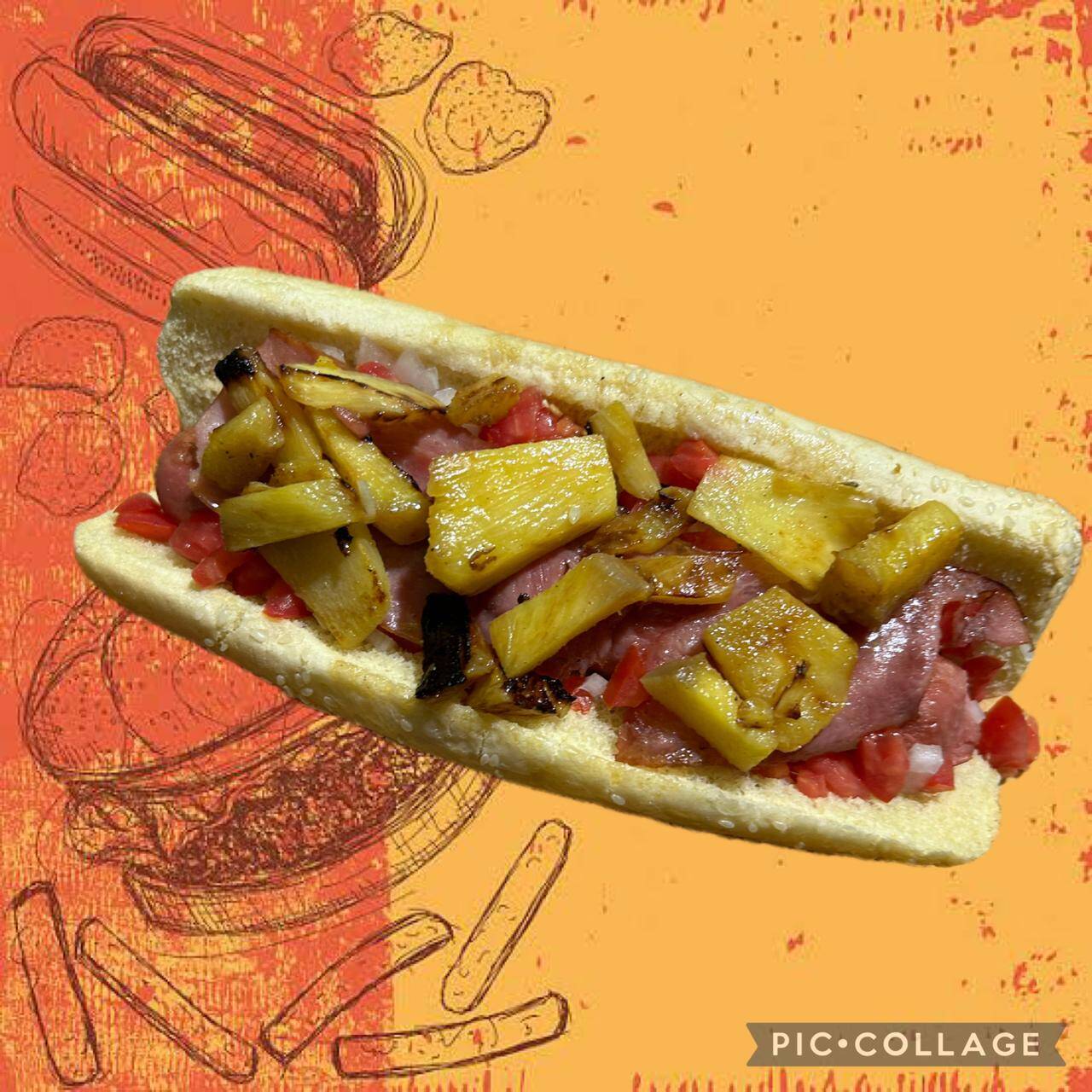 Salchicha, jitomate, tocino, piña, cebolla y aderezos