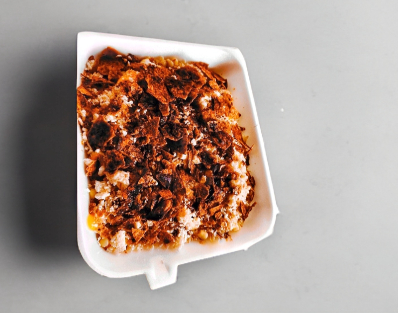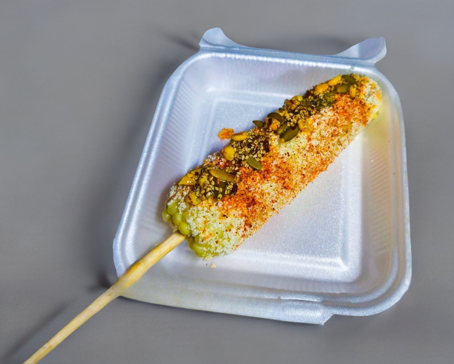 Para los indecisos, te llevas un enorme elote partido por la mitad y revolcado en fritura de tu elección, sentado sobre 150gr de esquite preparado con mayonesa, queso fresco y cheddar, salsa y toppings de tu elección.