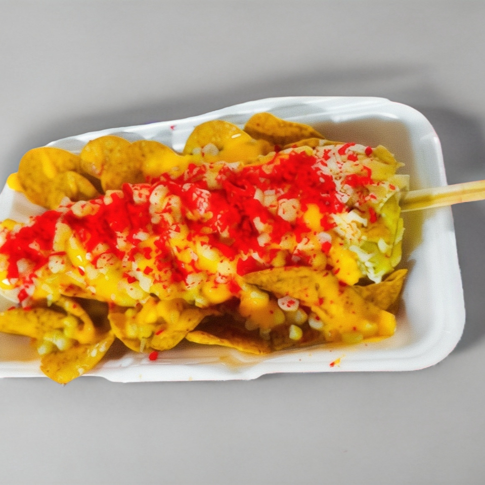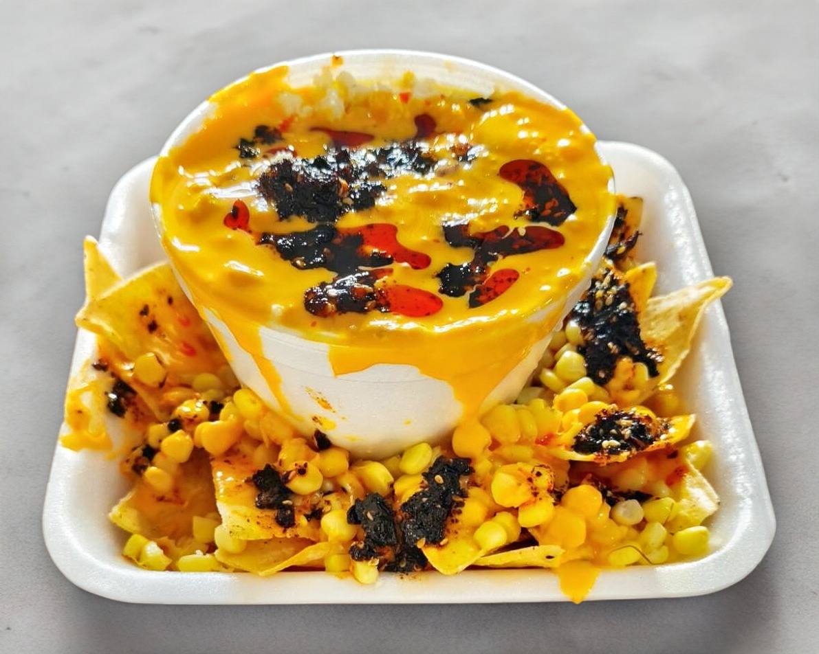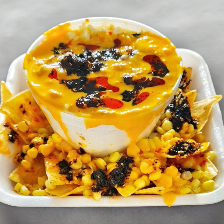 Un enorme elote entero preparado con los toppings y aderezos de tu gusto, acompañado con nachos bañados en queso cheddar caliente.