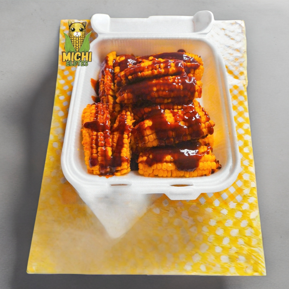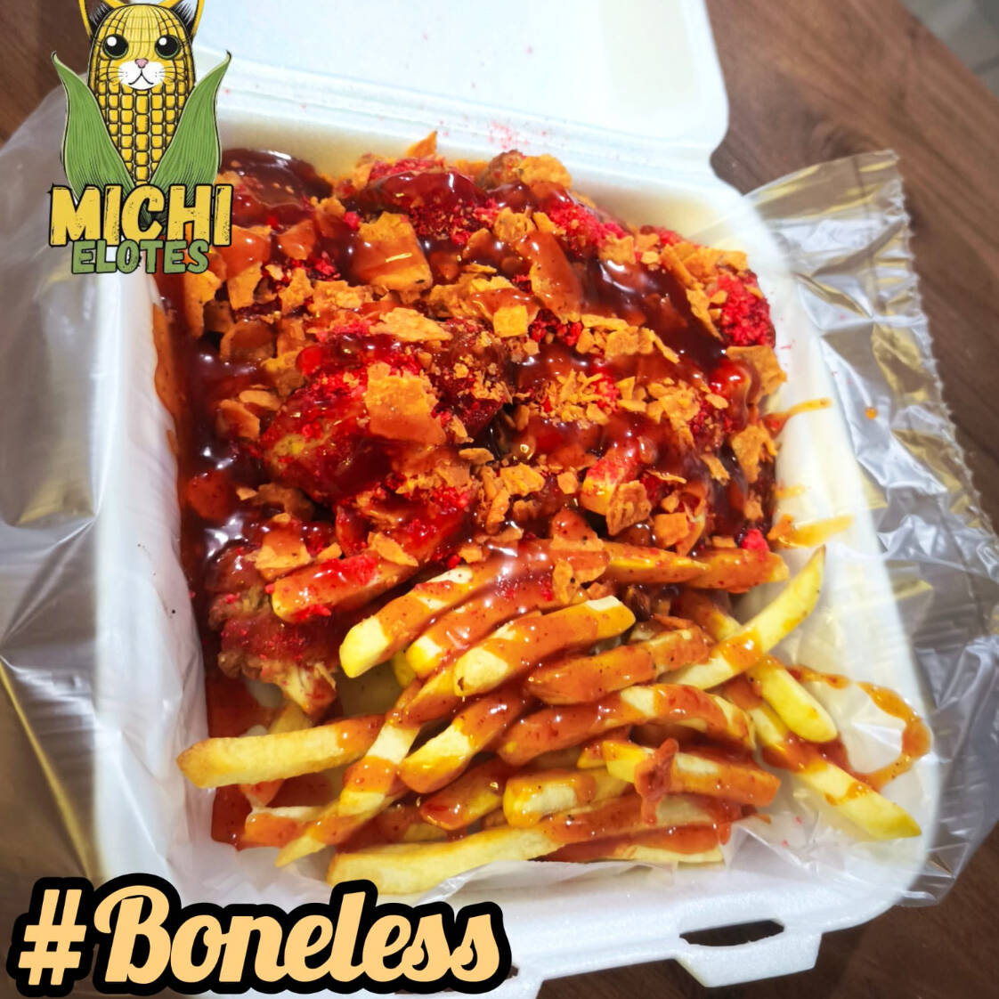 250 gr. de deliciosos boneless bañados en tu salsa favorita, sobre una cama de 300 gramos de fabuloso esquite preparado con los ingredientes más frescos, compártelo o deboralo!