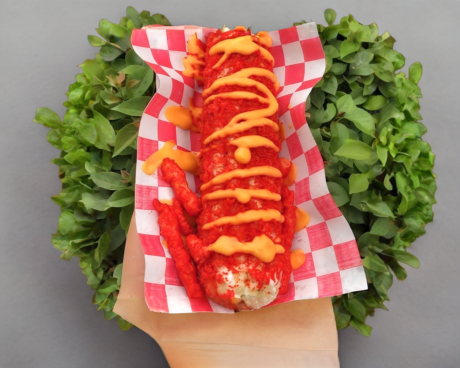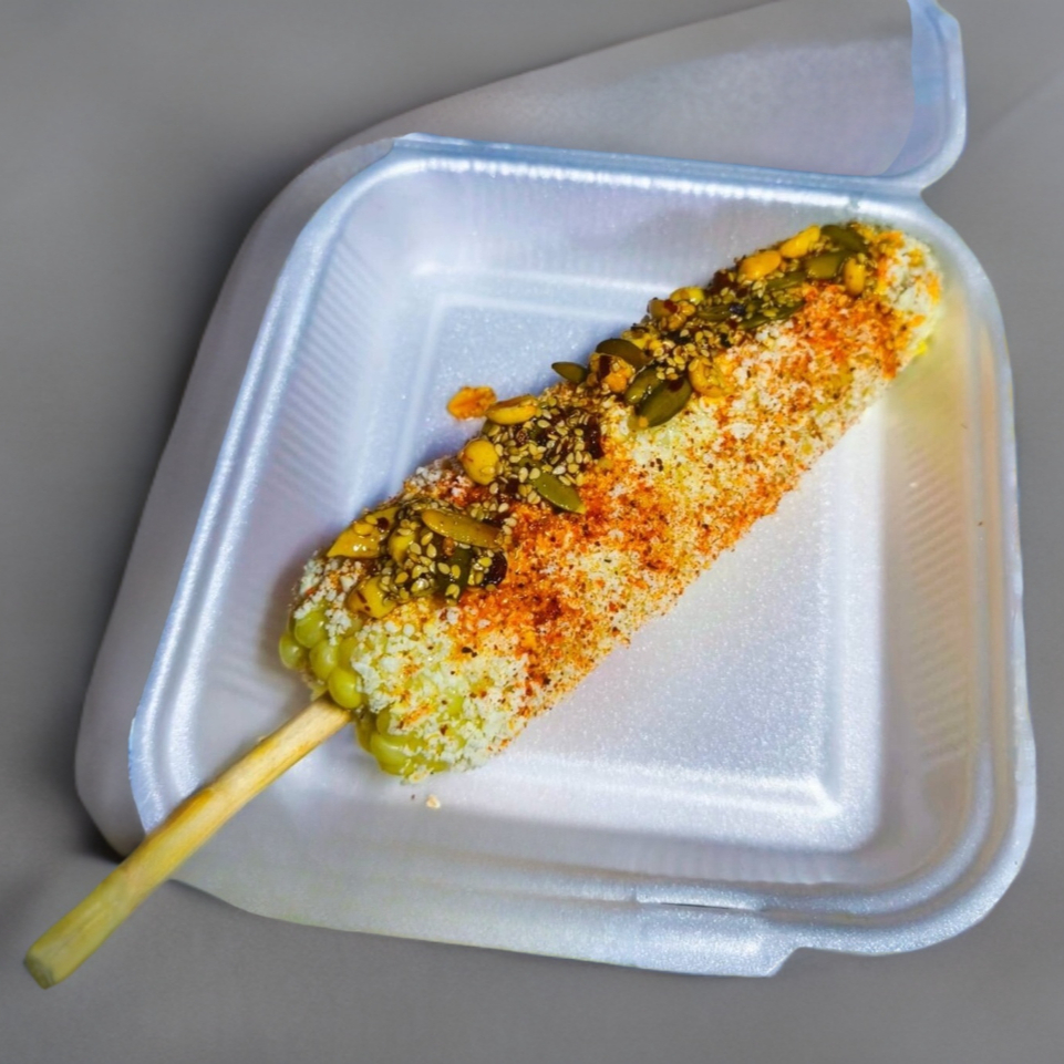 Un enorme elote, embarrado con mayonesa y revolcado sobre alguno de nuestras 9 frituras, rodeado de queso cheddar y espolvoreado con delicioso queso blanco, y algunade nuestras salsas favoritas