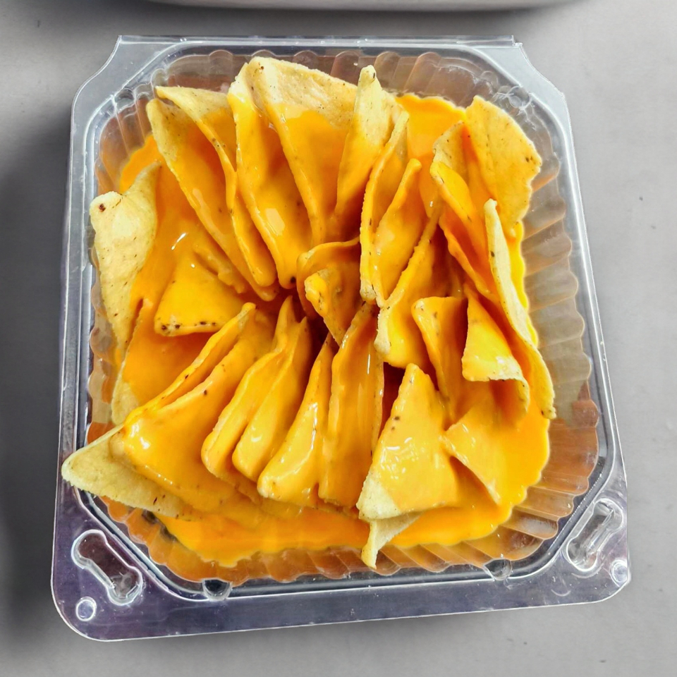 Un esquite grande de 10oz. preparado con mayonesa, queso cheddar, queso fresco y mantequilla, sentado en un contendor y rodeado con tostitos salsa verde, al final bañado de queso cheddar hasta que se desborde para convertirse en deliciosos nachos!