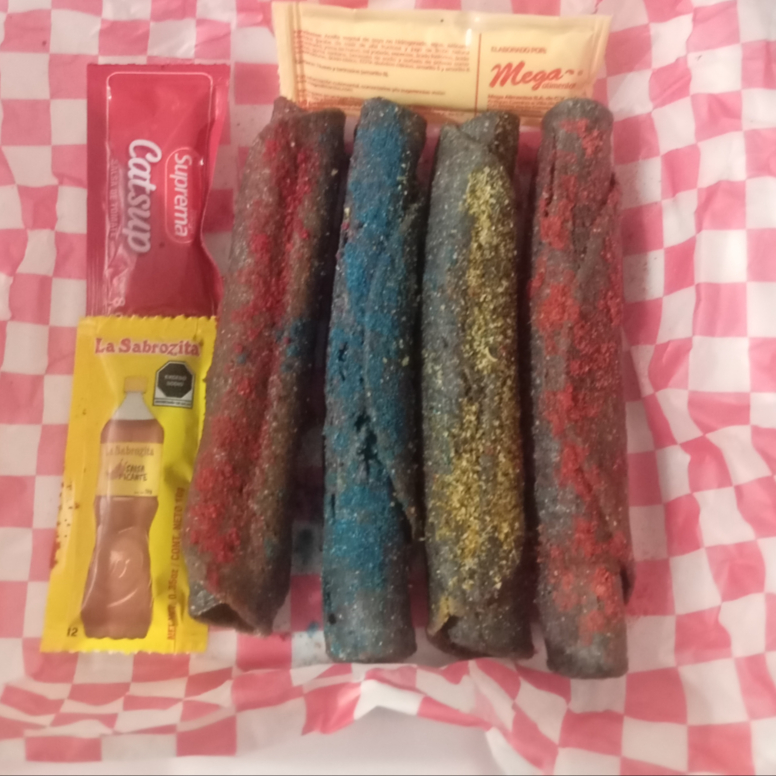 Tacos dorados de pollo (tortilla de masa verde) tamaño estándar de tortillería con un sabor a elegir: Cheeetos torciditos, Runners, Ruffles de queso, Chips Jalapeño, Toreadas Habanero, Sabritas adobadas, Sabritas Crema y especies, Takis Fuego, Takis blue heat, Doritos pizzerola, Doritos xtra flamin hot, Doritos Incognita, Doritos Nacho.