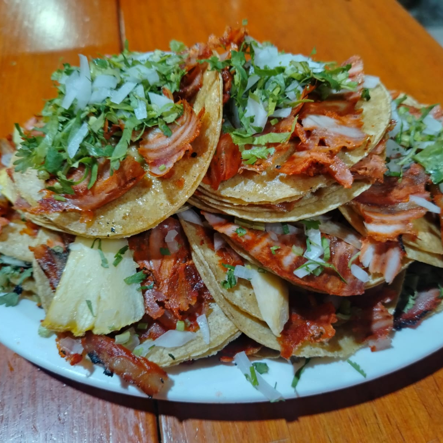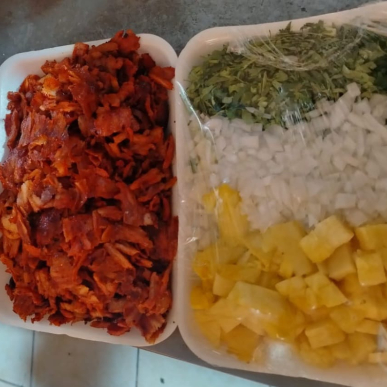 doble tortilla de maiz la carne piña, lleva aparte cilantro cebolla y salsa