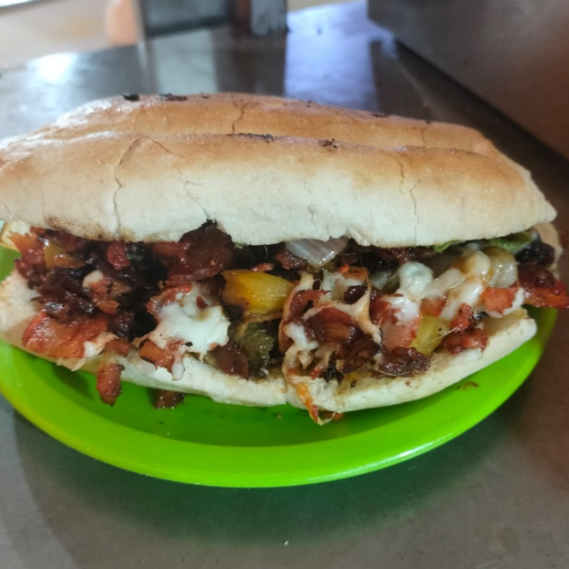 Chuleta, tocino, morrón, cebolla y queso incluye tortillas