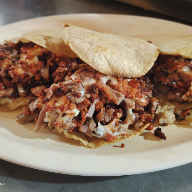 orden de 3 piezas (tostadas de maiz, carne a elegir y queso fundido))