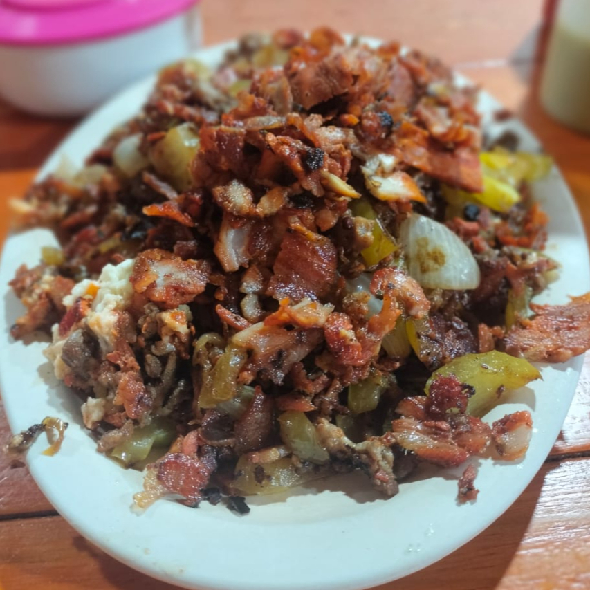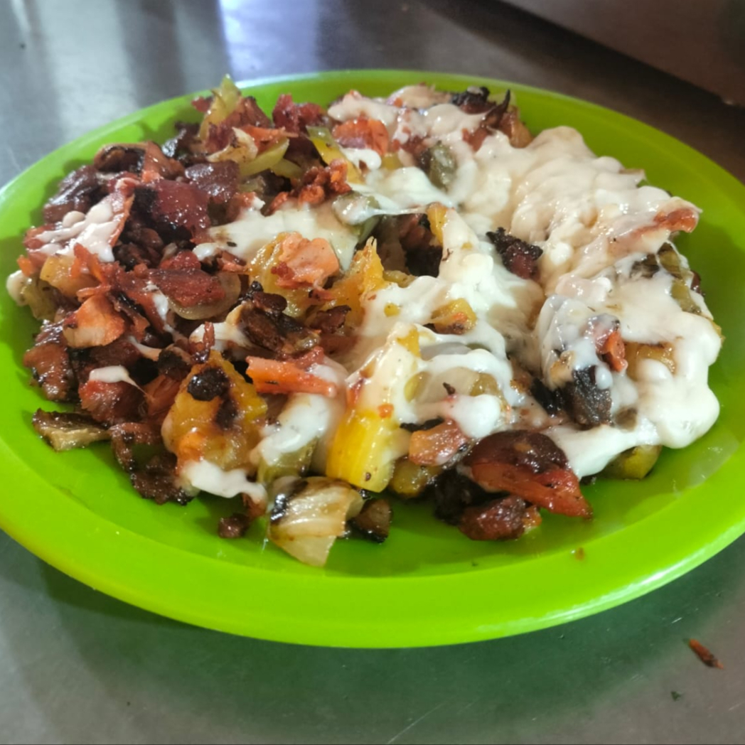 morron cebolla tocino la carne a elegir y queso. Incluye tortillas y salsas