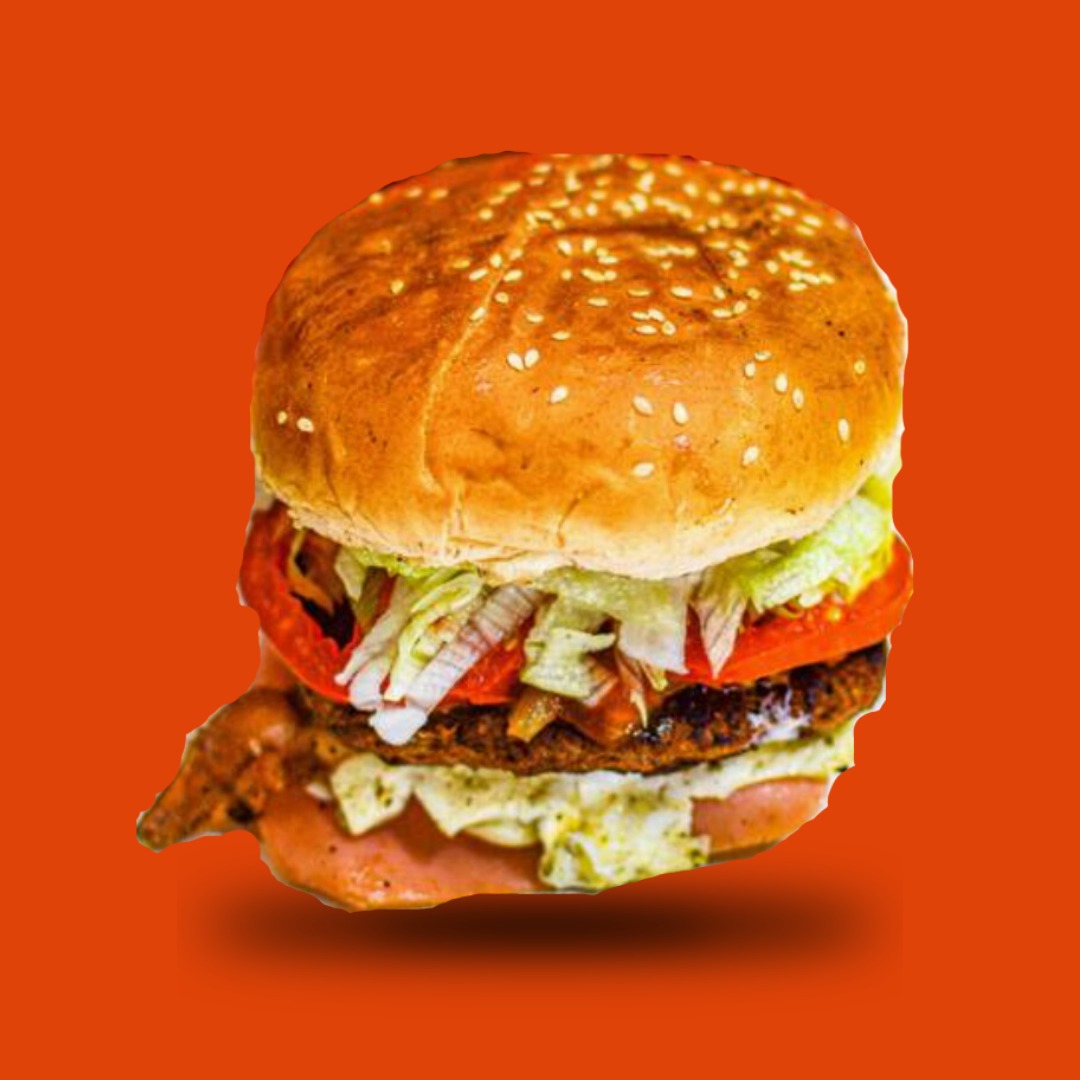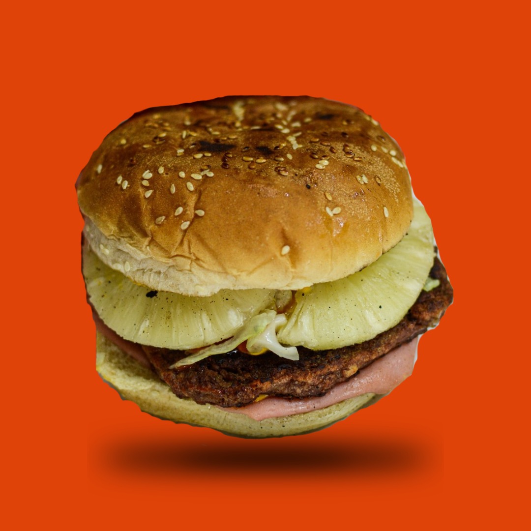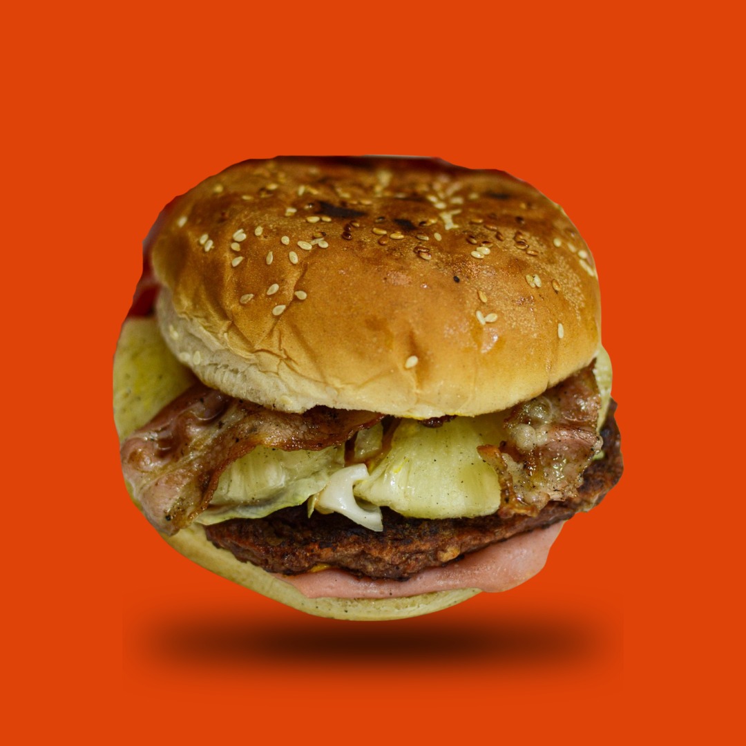 2 carnes, 3 panes, tocino, jamón, piña, lechuga, jitomate, cebolla,picante, catsup, mostaza