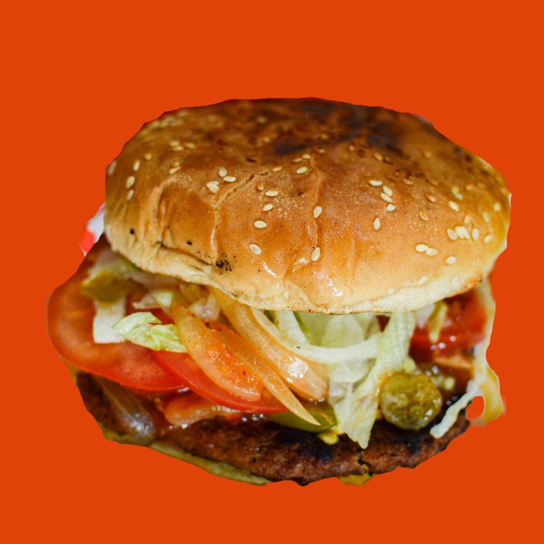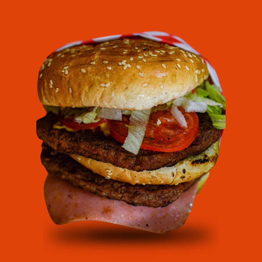 2 carnes, 3 panes, tocino, jamón, lechuga, jitomate, cebolla,picante, catsup, mostaza