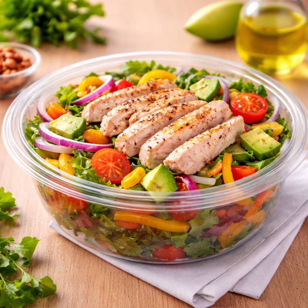 Ensalada con base de lechuga, atún en agua o pollo asado, jitomate, pimiento, cebolla morada, aceituna, pepino, elote amarillo, aguacate y aderezo