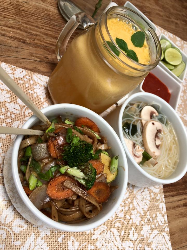 Noodle de arroz, pollo, brócoli, mix pimientos, piña, zanahoria, salsa sweet chilli, cacahuate, cilantro.