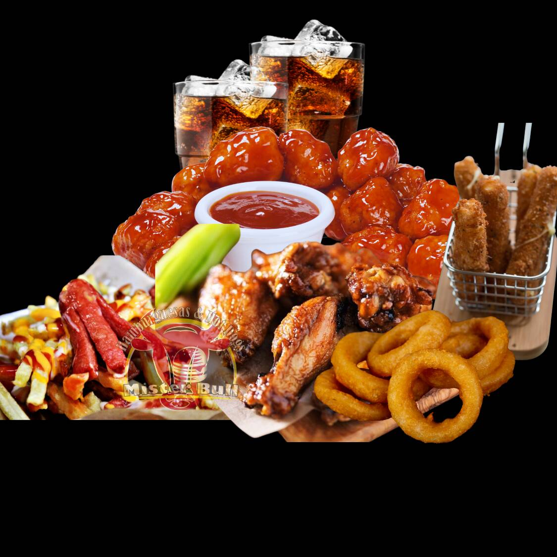 6 Alitas Doraditas*1 + Bonelesss*1 + Salchipapas*1 + Aros de Cebolla*1 + 4 dedos de queso*1 + Pepsi 400 ml*2