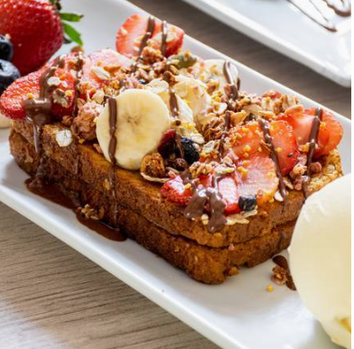 Pan francés (una pieza) de masa madre con crema de avellana, plátano y fresas naturales cubierta con granola y una bola de helado del sabor de tu elección (fresa, vainilla, chocolate o cookies & cream).