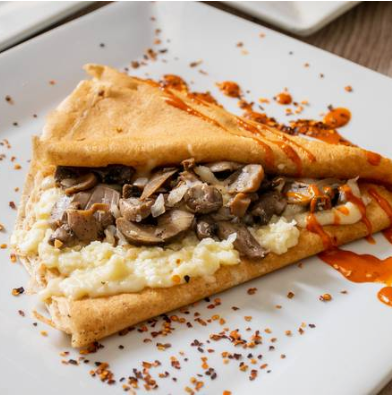 Crepa hecha con nuestra mezcla de quesos (manchego, cheedar y oaxaca) y champiñones salteados.