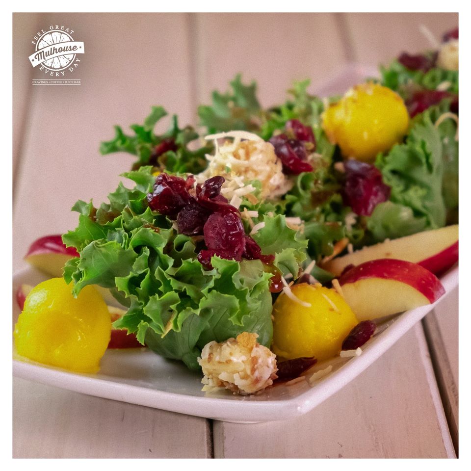 Lechuga, mango, manzana, bolitas de Philadelphia con coco y arándanos.