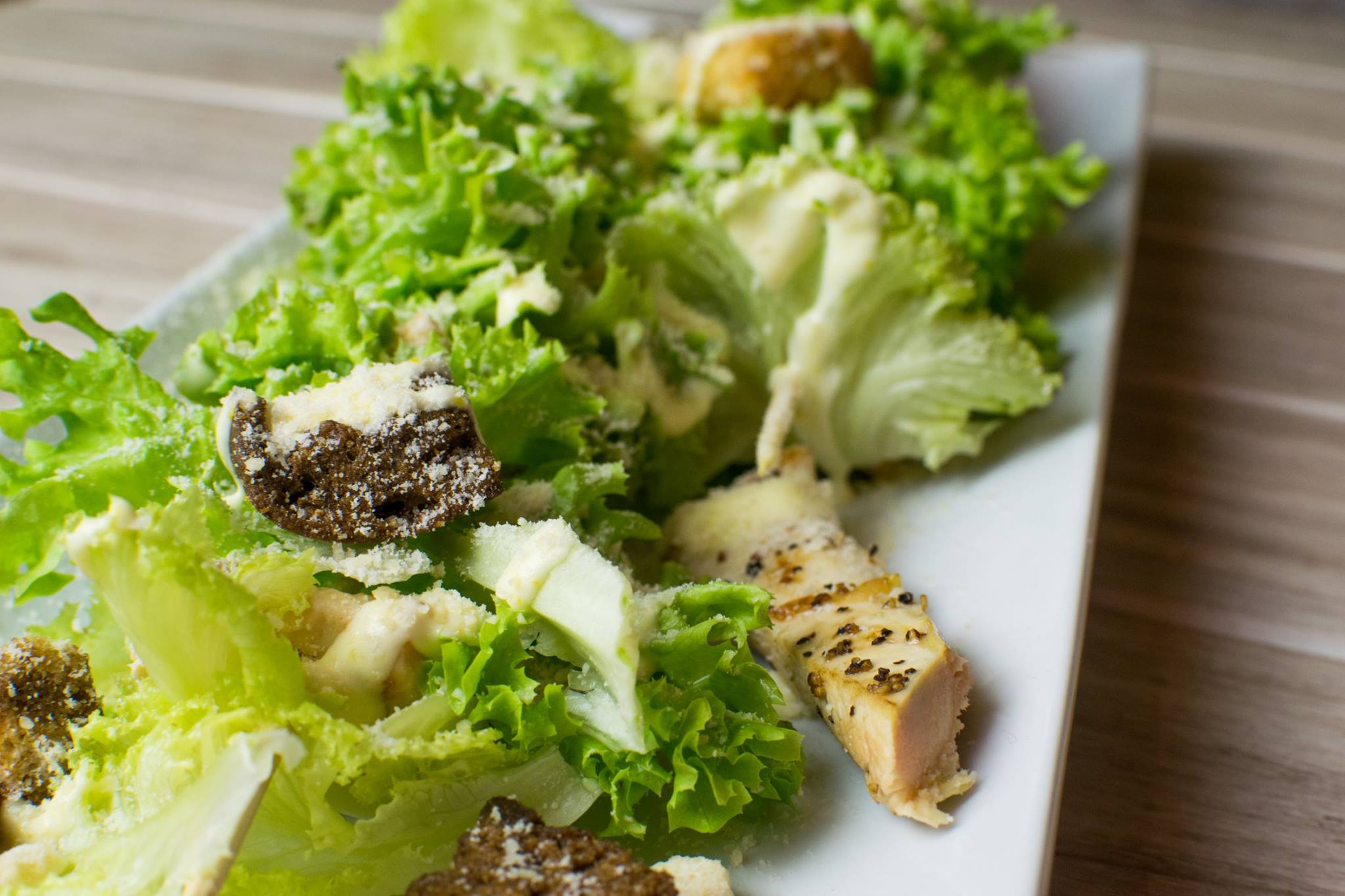 Lechuga, pollo, crutones, queso parmesano y aderezo.