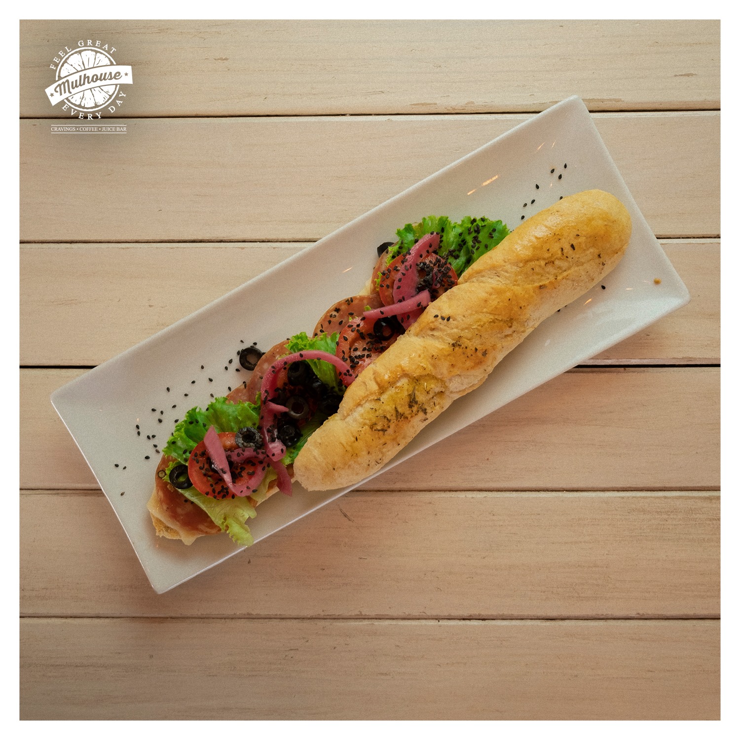 con jamón de pavo,Pan baguette artesanal con queso mozzarella , lechuga, jitomate, pepinillos y aceituna negra.