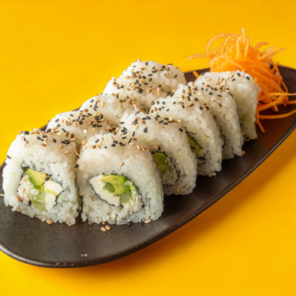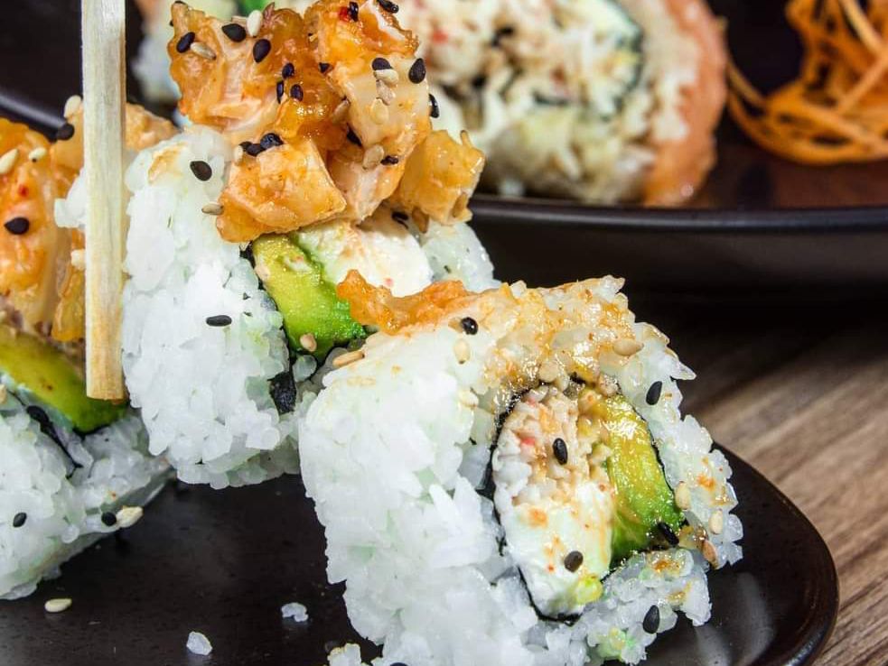 Rollo relleno de cangrejo picante, aguacate y queso crema