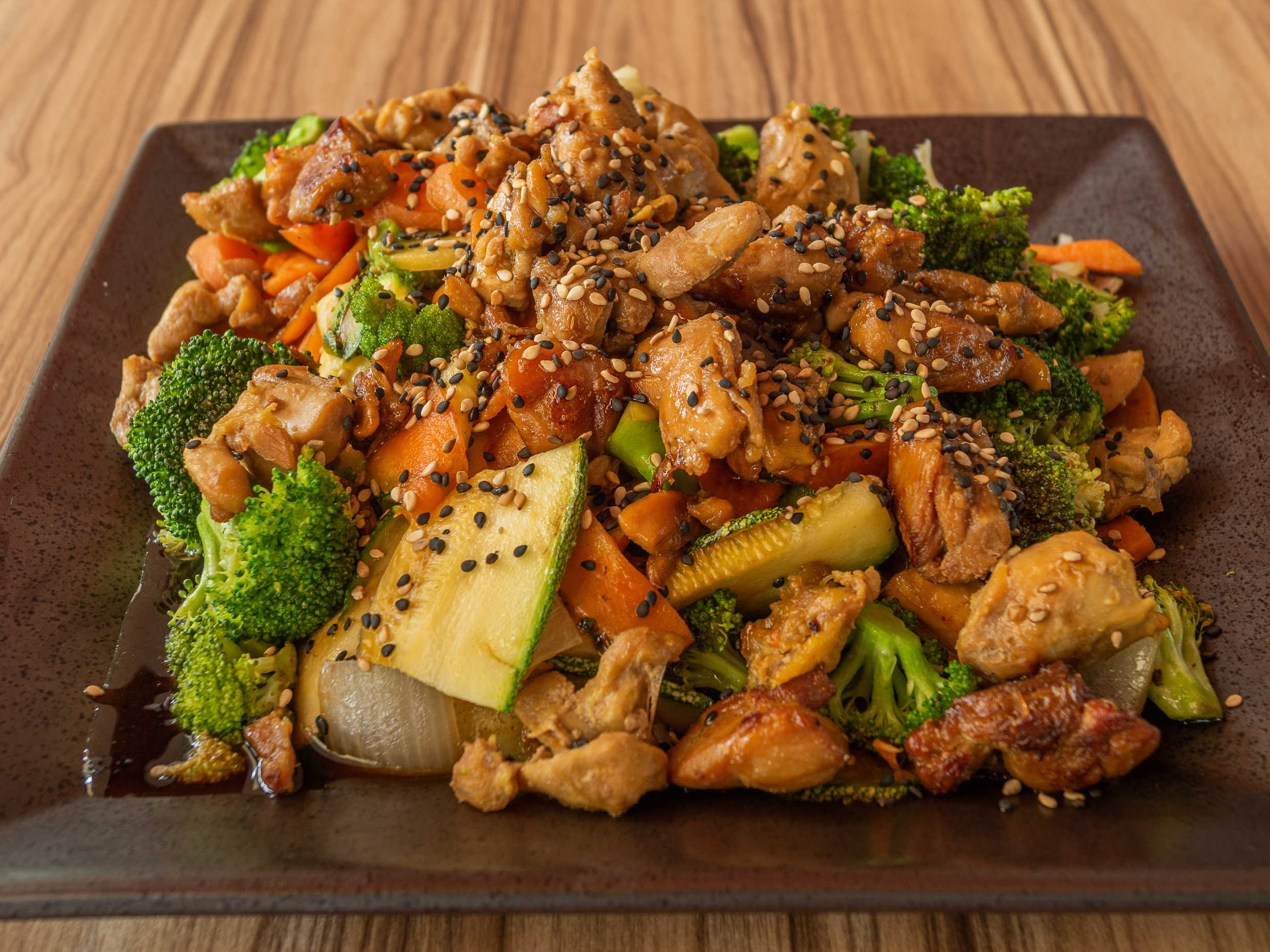 Cama de arroz con vegetales mixtos y pollo a la planchaTeriyaki de Pollo