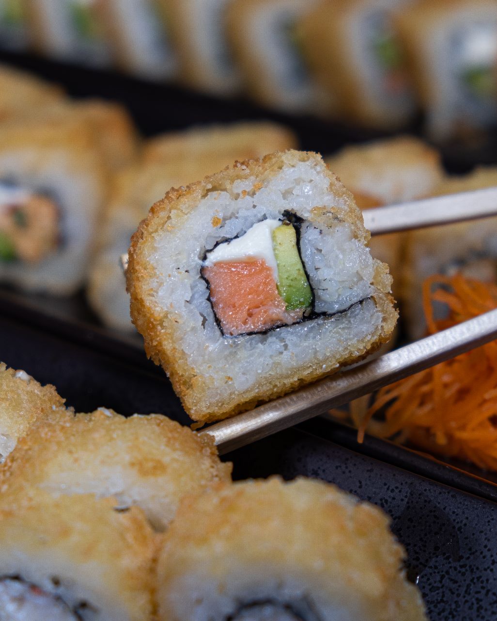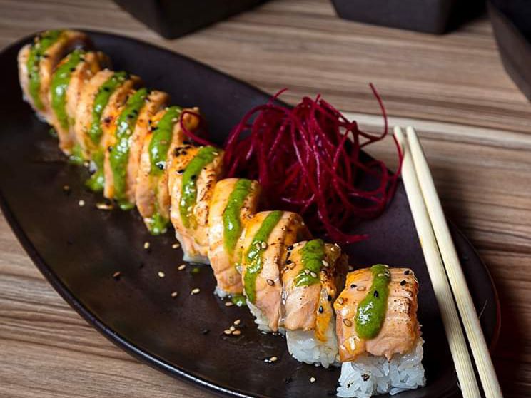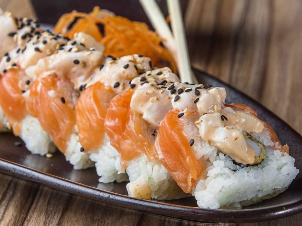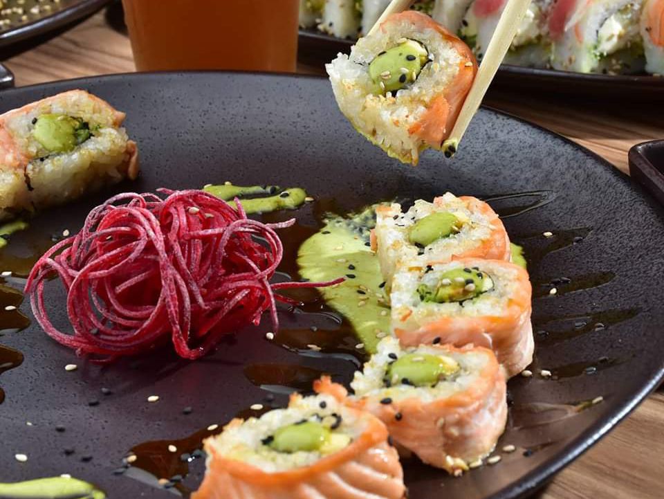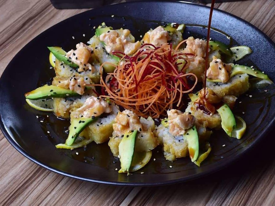 Laminas de salmón rellenas de aguacate y kanikama spicy, bañados en la salsa secreta de la casa