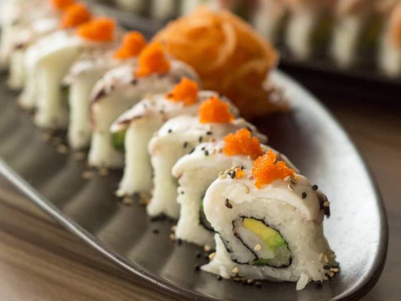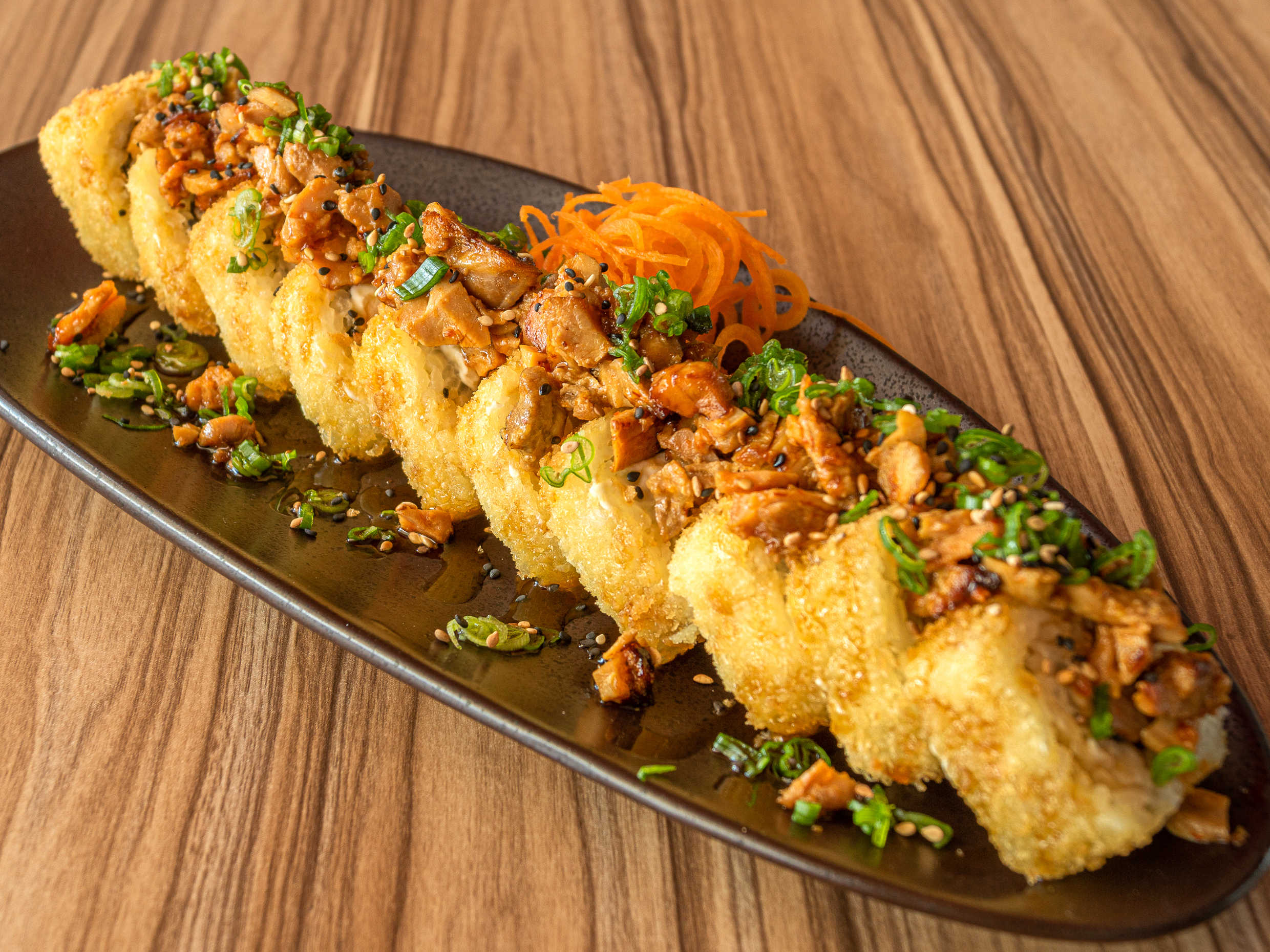 Relleno de queso, aguacate, pepino y camarón; forrado de pulpo cubierto con toque de Masago