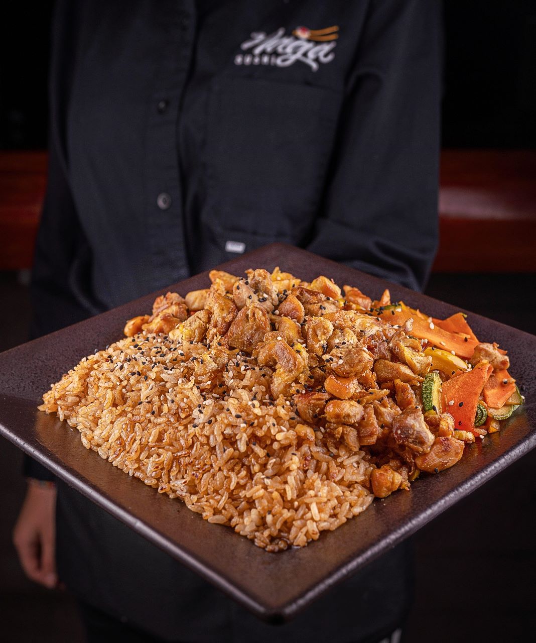 Arroz frito con vegetales mixtos, pollo y res a la plancha, aguacate, queso crema y camarón spicy encima