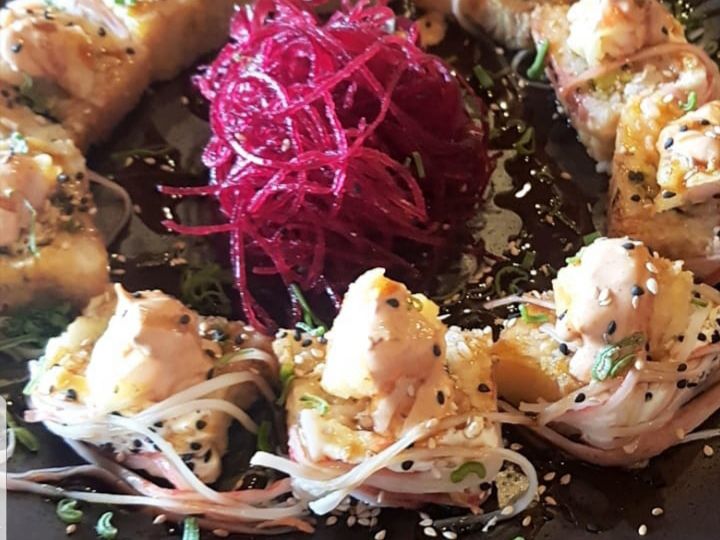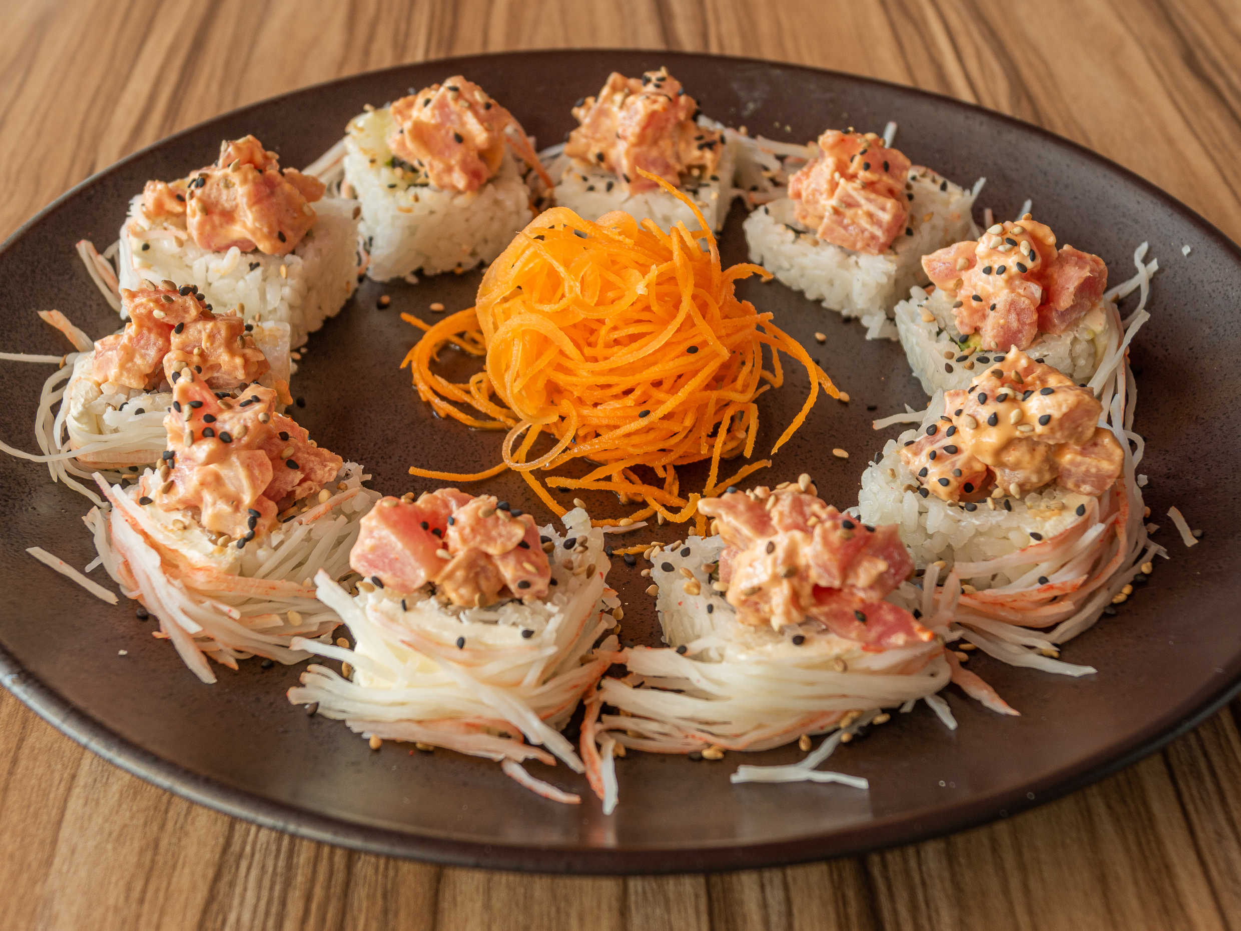 Relleno de pepino, aguacate, camarón forrado de queso y kanikama con atún spicy
