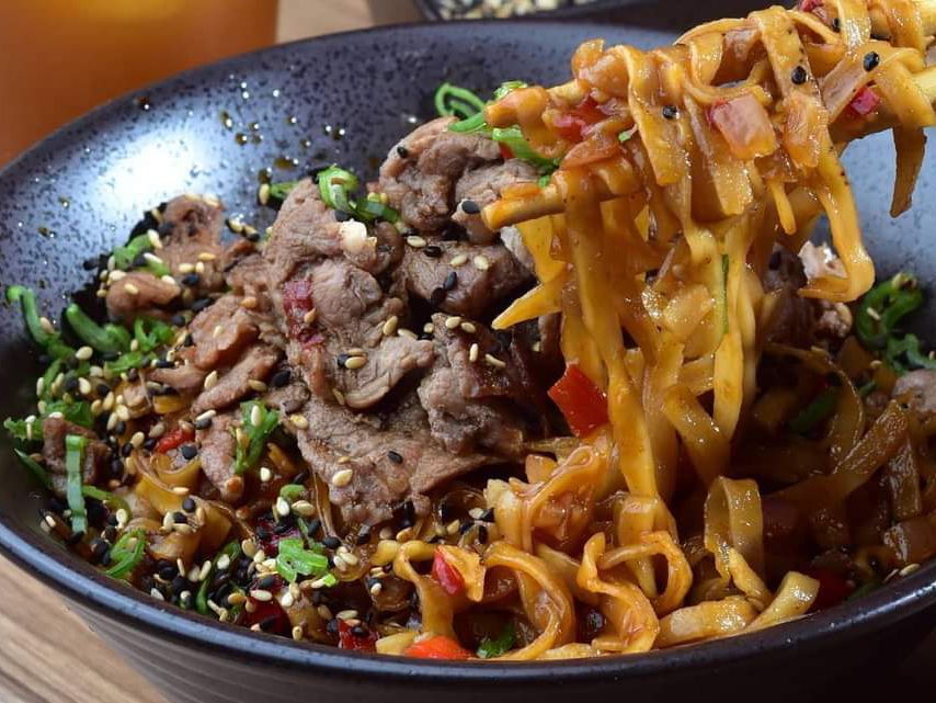 Fideos de huevo salteados picositos con pimiento morrón y res