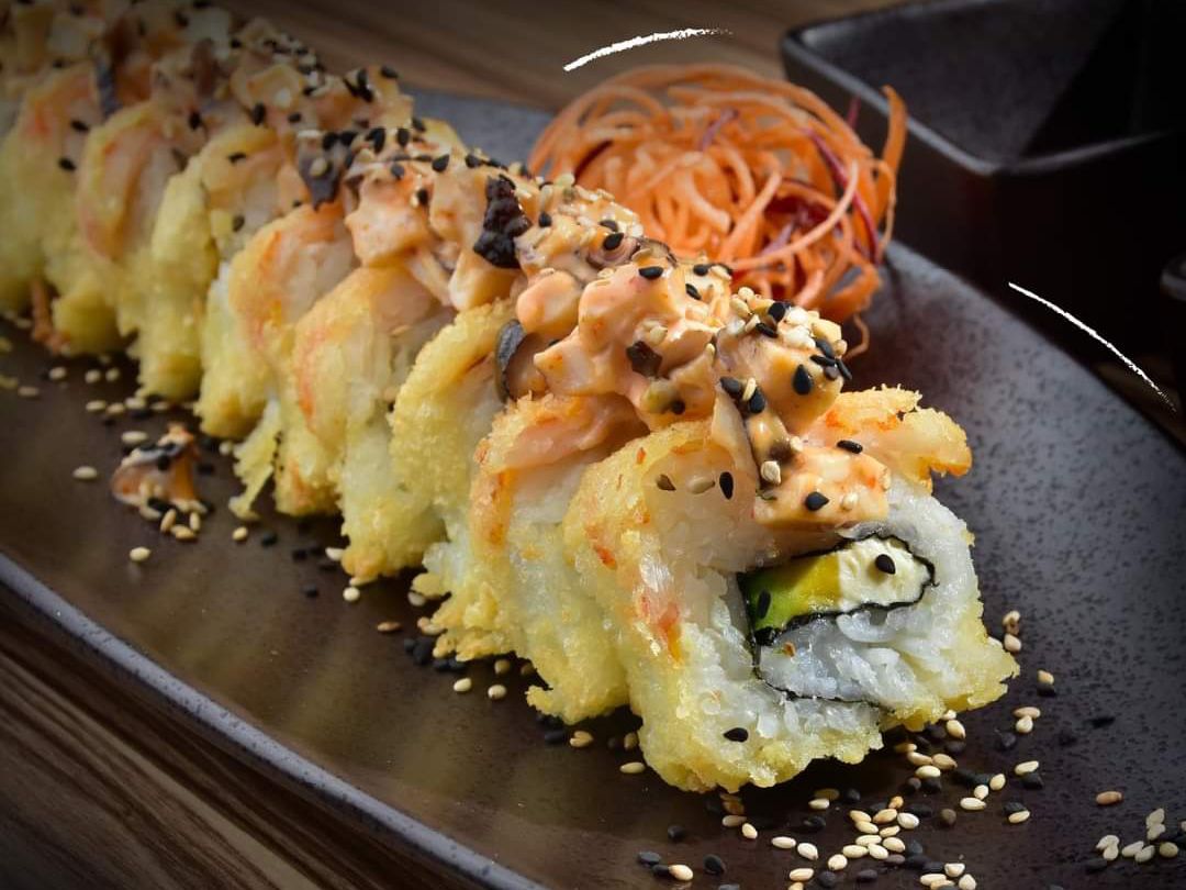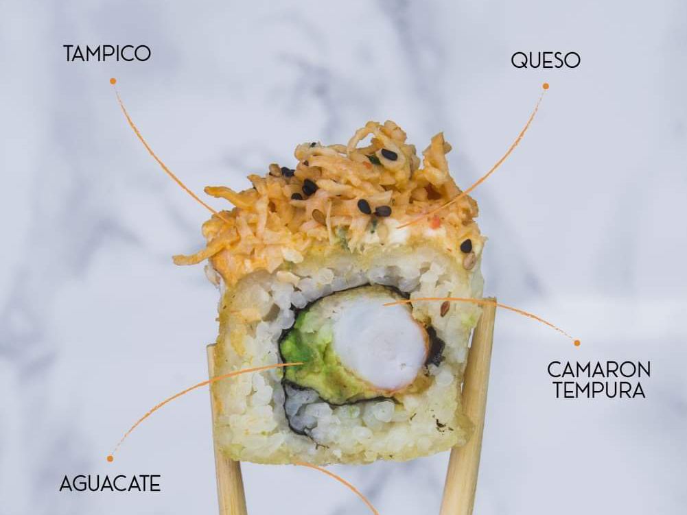 Relleno de camarón tempura, aguacate, forrado de queso, cubierto de tampico