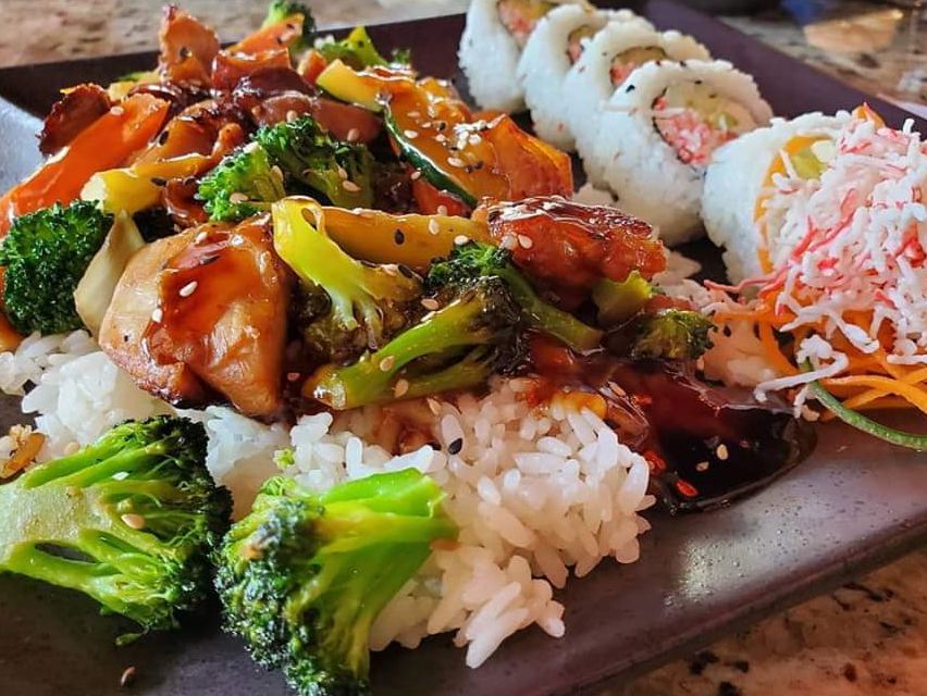 Media Orden de teriyaki de pollo, media orden de rollos california y ensalada tampico