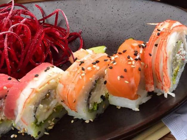 Rollo capeado relleno de queso aguacate y cangrejo, cubierto con cangrejo y salmón spicy sopleteado, todo cubierto con sashimis de diferentes mariscos con un toque de salsa de anguila