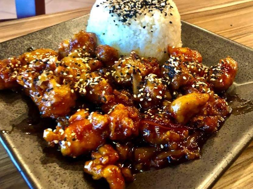 Pollo capeado salteado con cebollin y cebolla morada en salsa agridulce