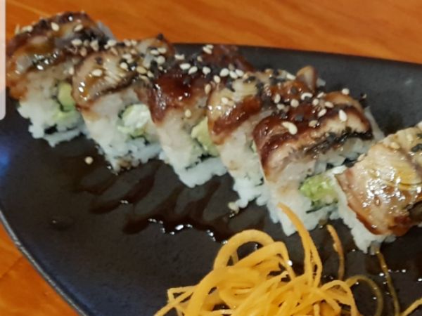 Camarón tempura, cangrejo, queso, aguacate con un toque de salsa de anguila