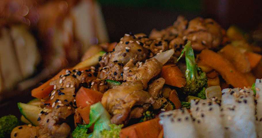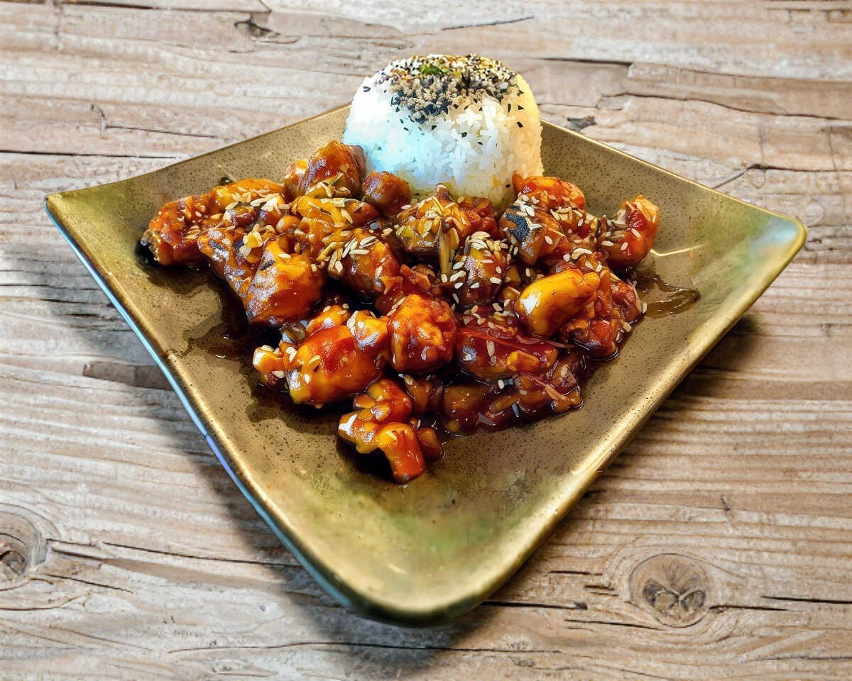 Pollo capeado salteado con cebollín y cebolla morada en salsa agridulce.