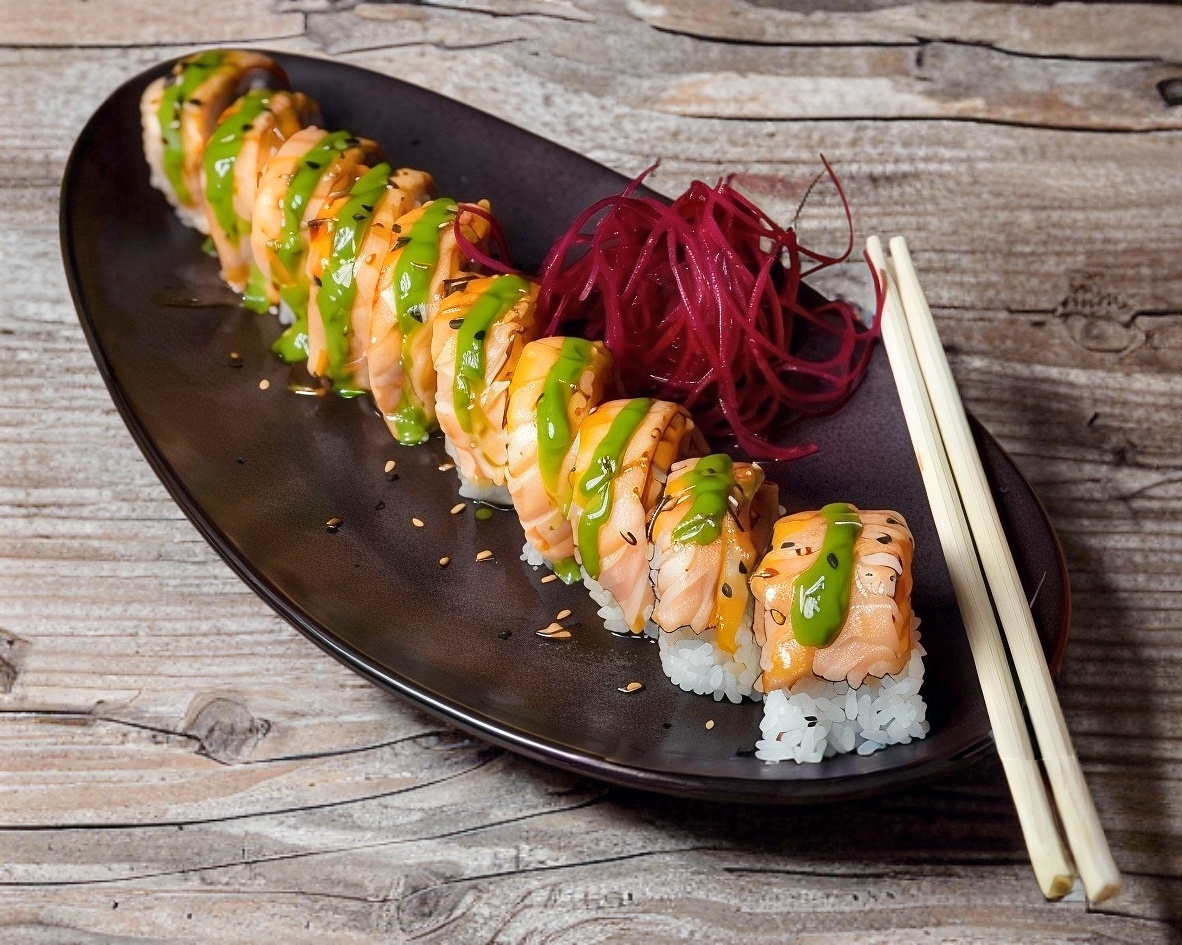 Rollo capeado relleno de queso aguacate y cangrejo, cubierto con cangrejo y salmón spicy sopleteado, todo cubierto con sashimis de diferentes mariscos con un toque de salsa de anguila.