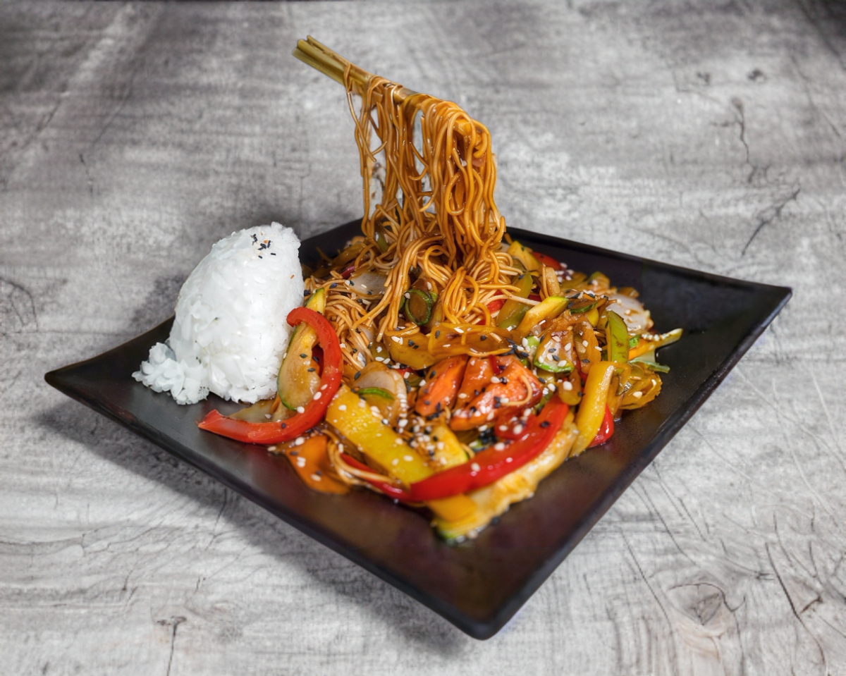 Fideos orientales salteados con vegetales mixtos, salsa yakisoba y pollo.