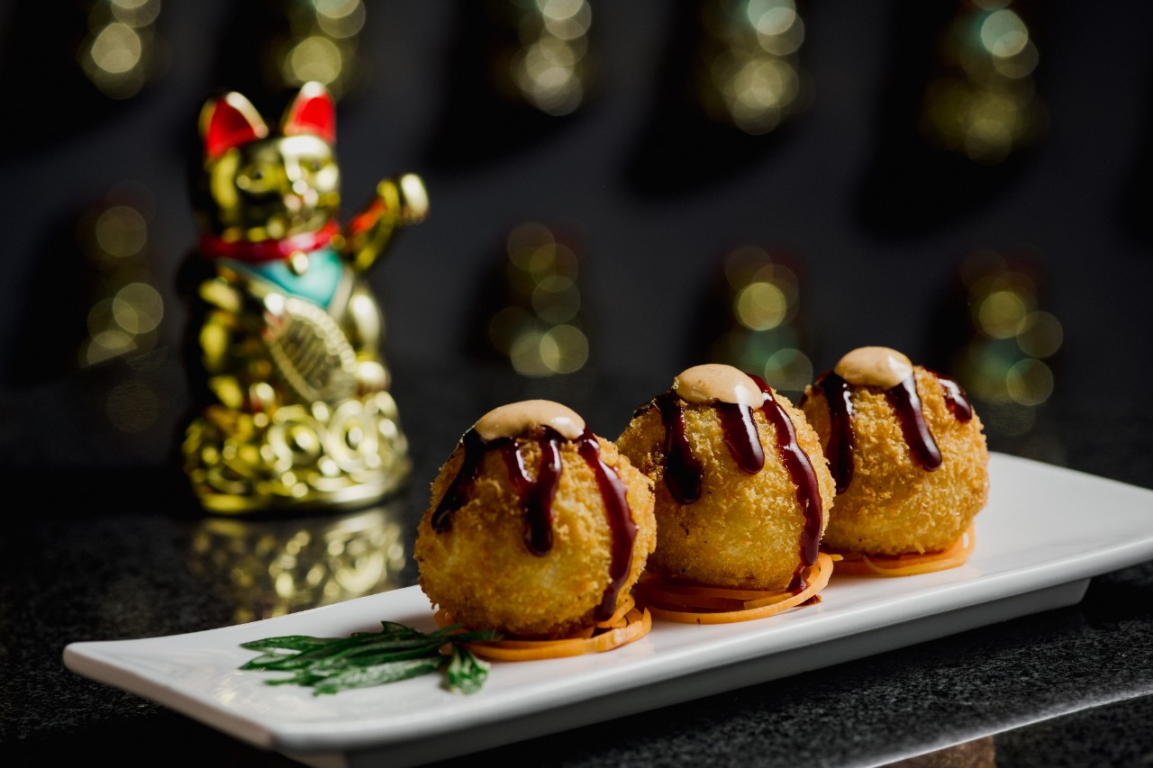 3 Bolas de Arroz frito mezclado con Queso Gouda acompañado de salsa chipotle y salsa kushiague