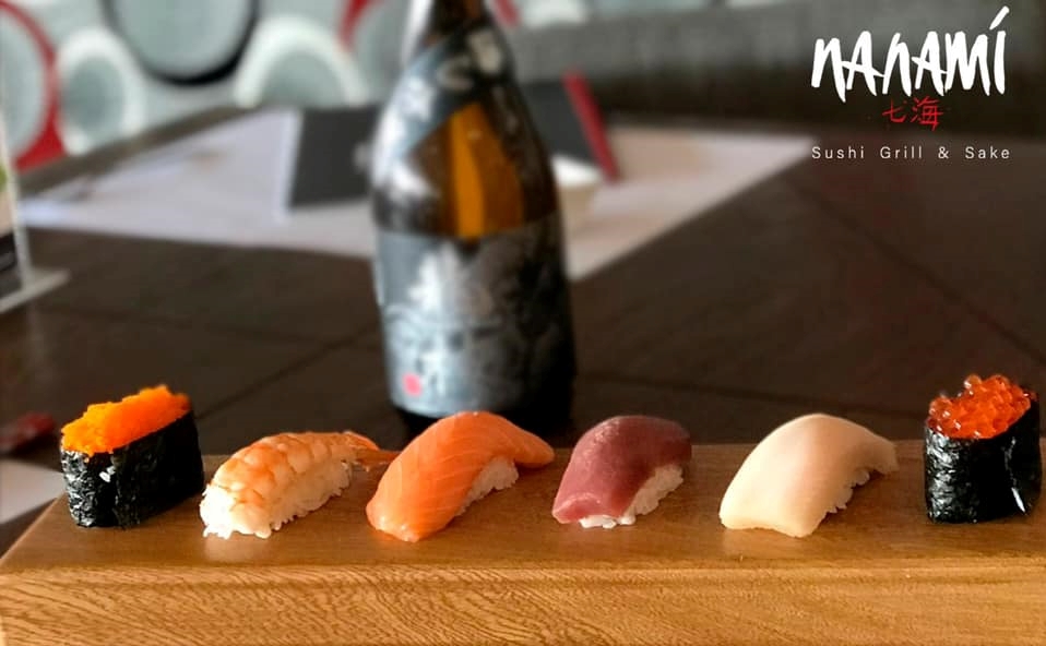 Hueva de pez volador por fuera, marisco a elegir, atún, salmón, hamachi o anguila.