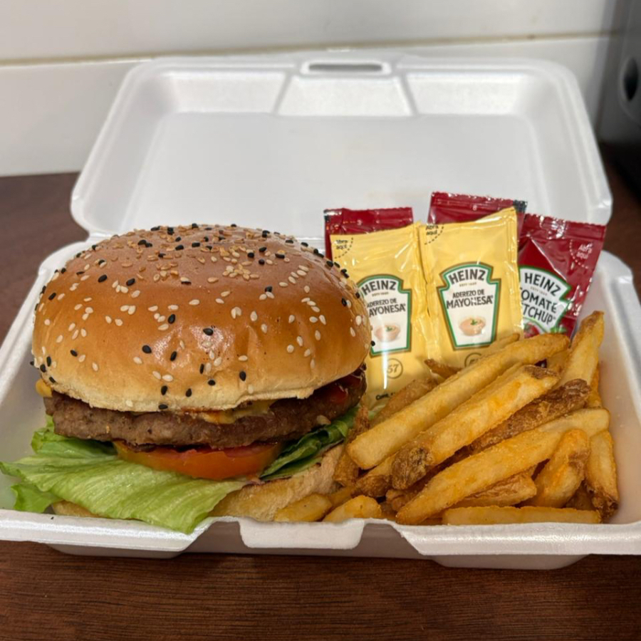 Contiene: Hamburguesa sencilla con carne de Sirloin (150 gr), aguacate, queso americano, cebolla, chile jalapeño, jitomate, lechuga, mayonesa y catsup. Con una orden de papas a la francesa (125 gr).