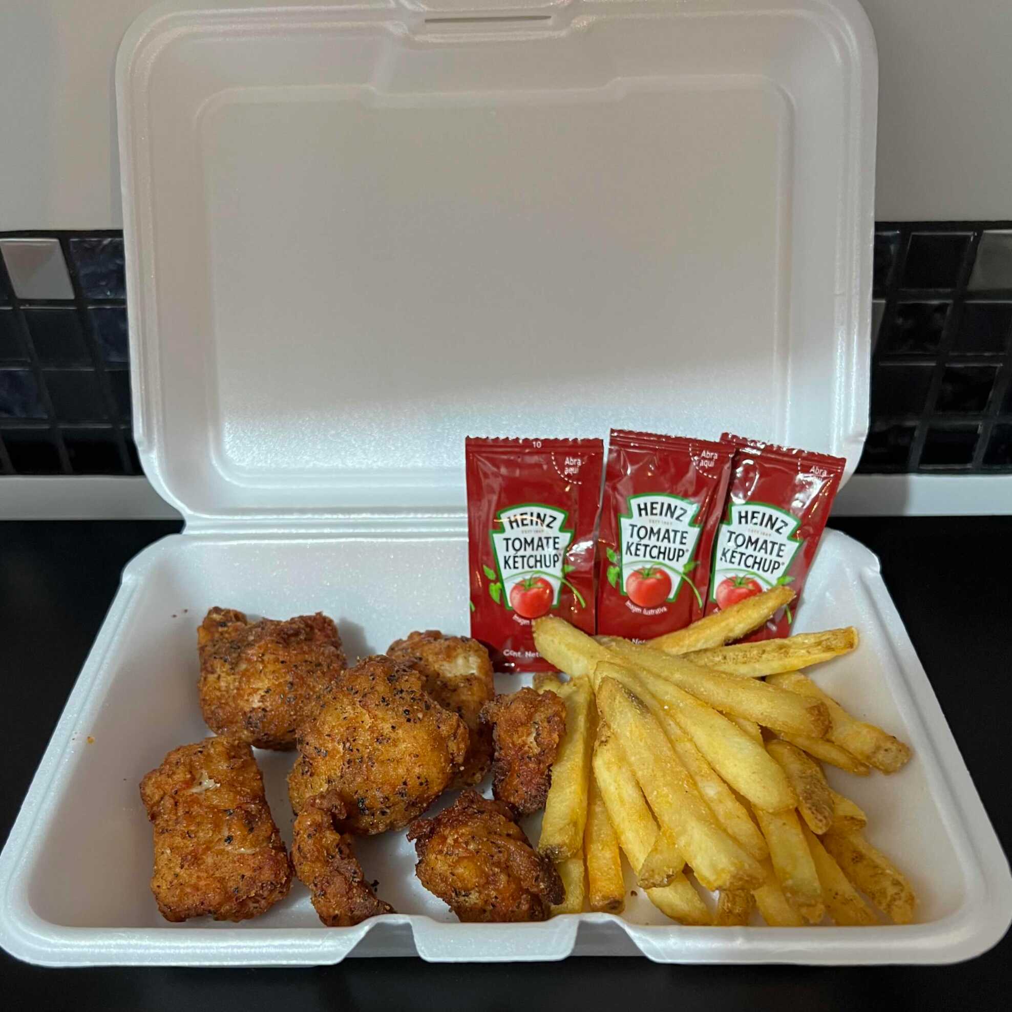 200 Gr de Boneless Lemon Papper 100% pechuga de pollo aproximadamente 6-7 piezas , acompañados con 125 Gr de papas a la francesa.