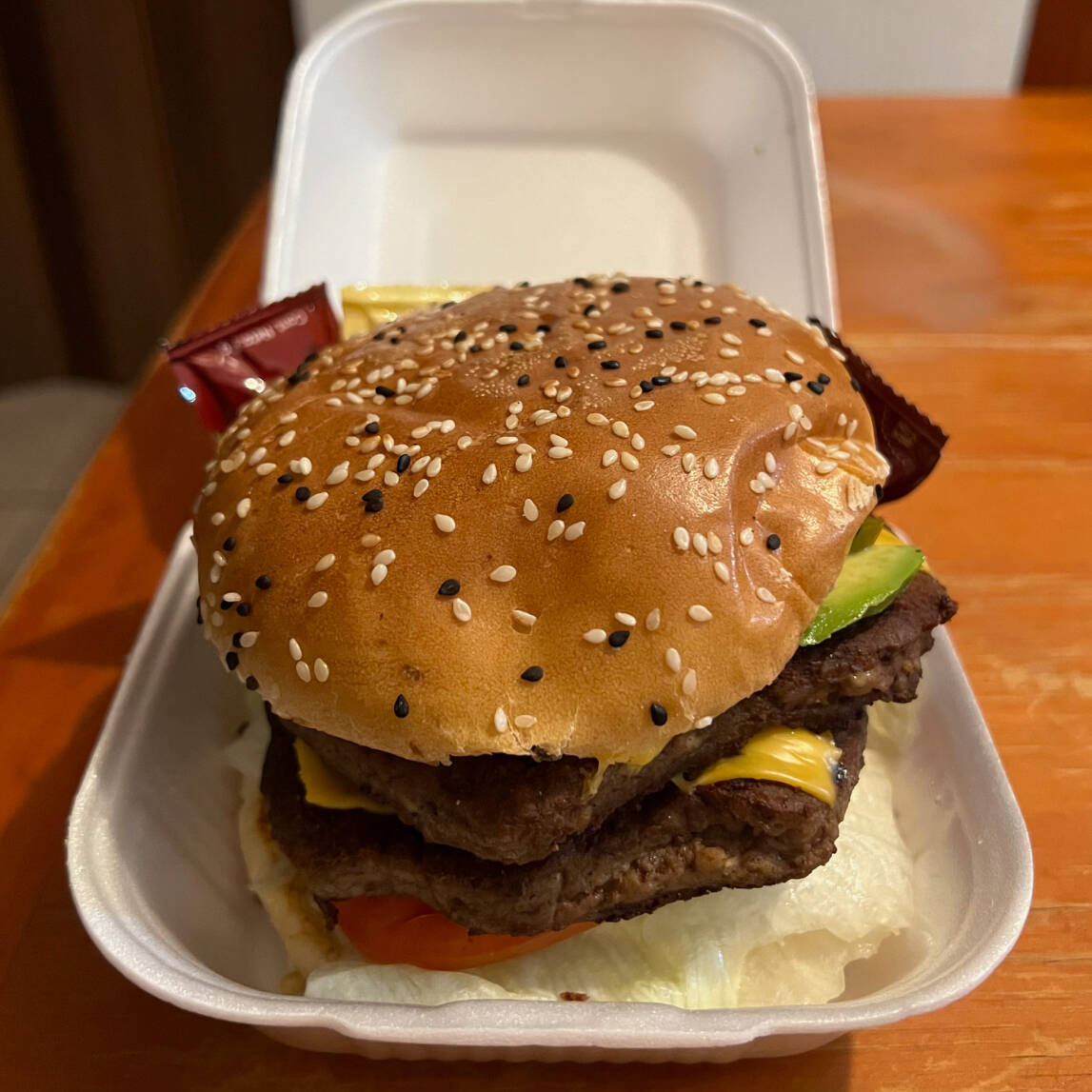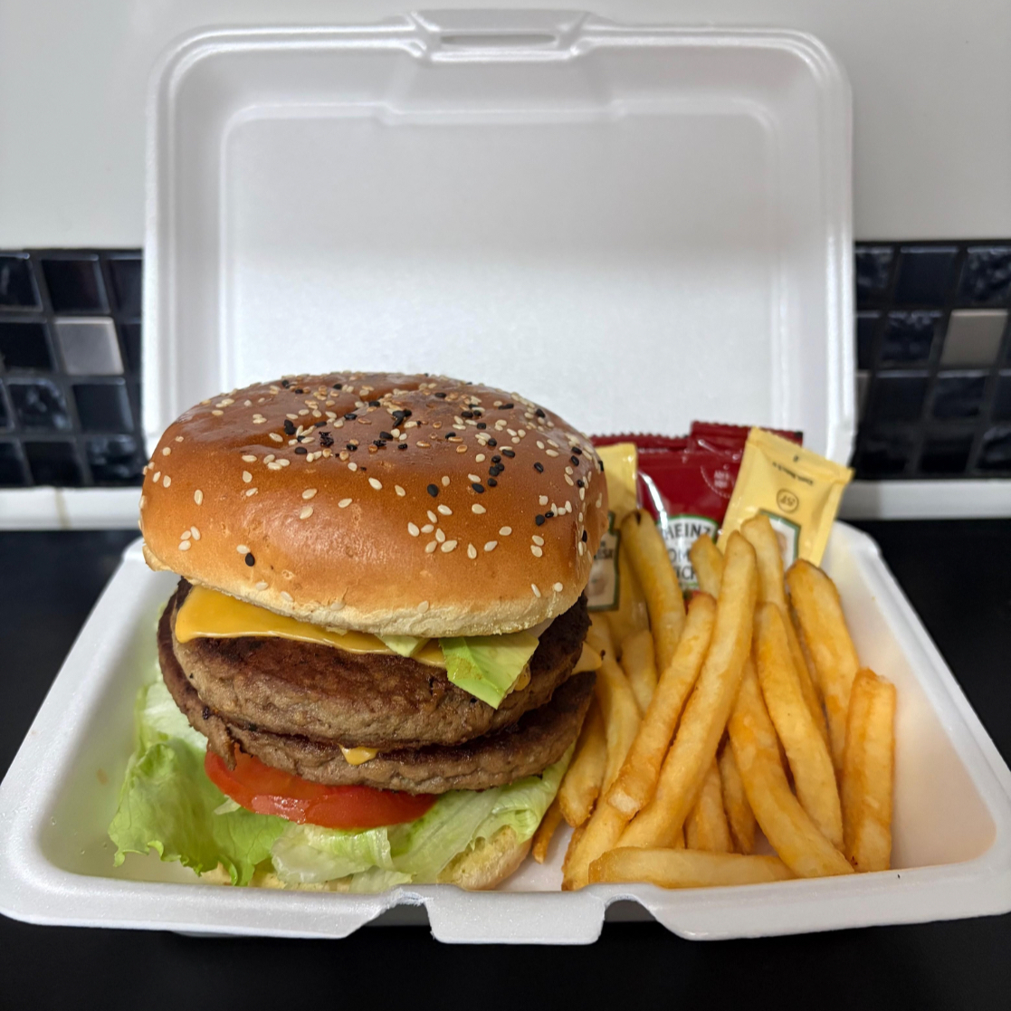 Doble carne de Sirloin (150 gr c/u), aguacate, queso americano, cebolla, chile jalapeño, jitomate, lechuga, mayonesa y catsup.