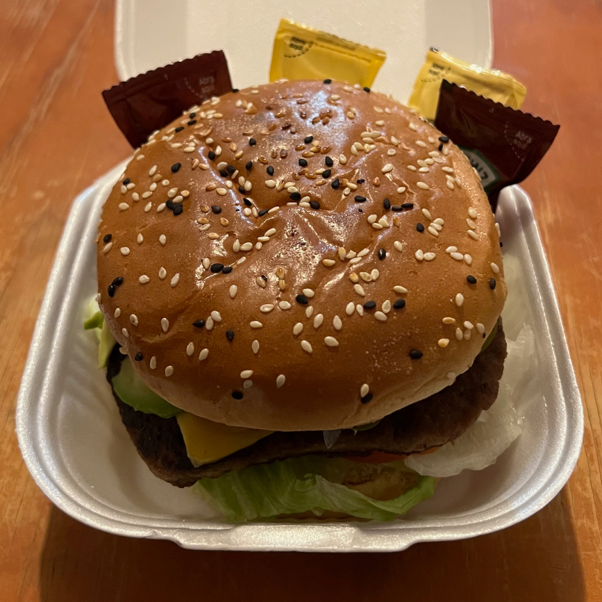 Carne de Sirloin (150 gr), aguacate, queso americano, cebolla, chile jalapeño, jitomate, lechuga, mayonesa y catsup.