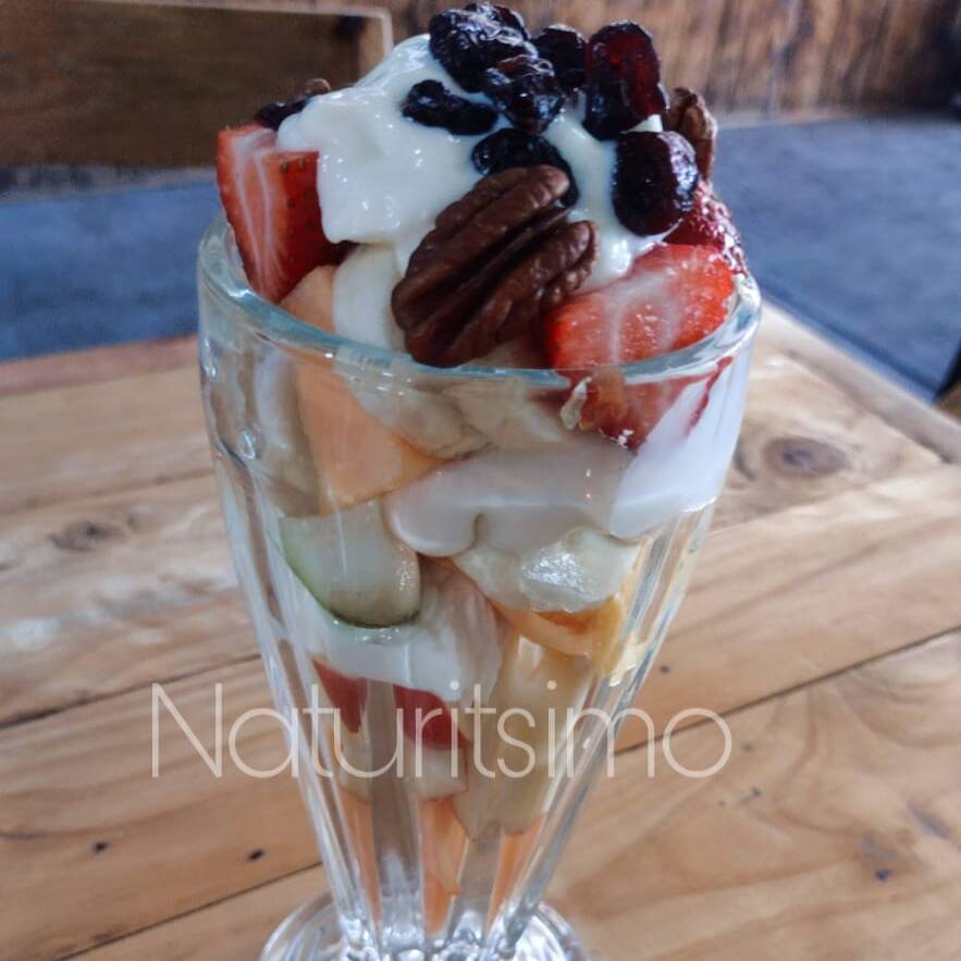 Mezcla de frutas de la estación, con yogurt griego y dos toppings de cereal. Aderezado con Miel de abeja 100% natural